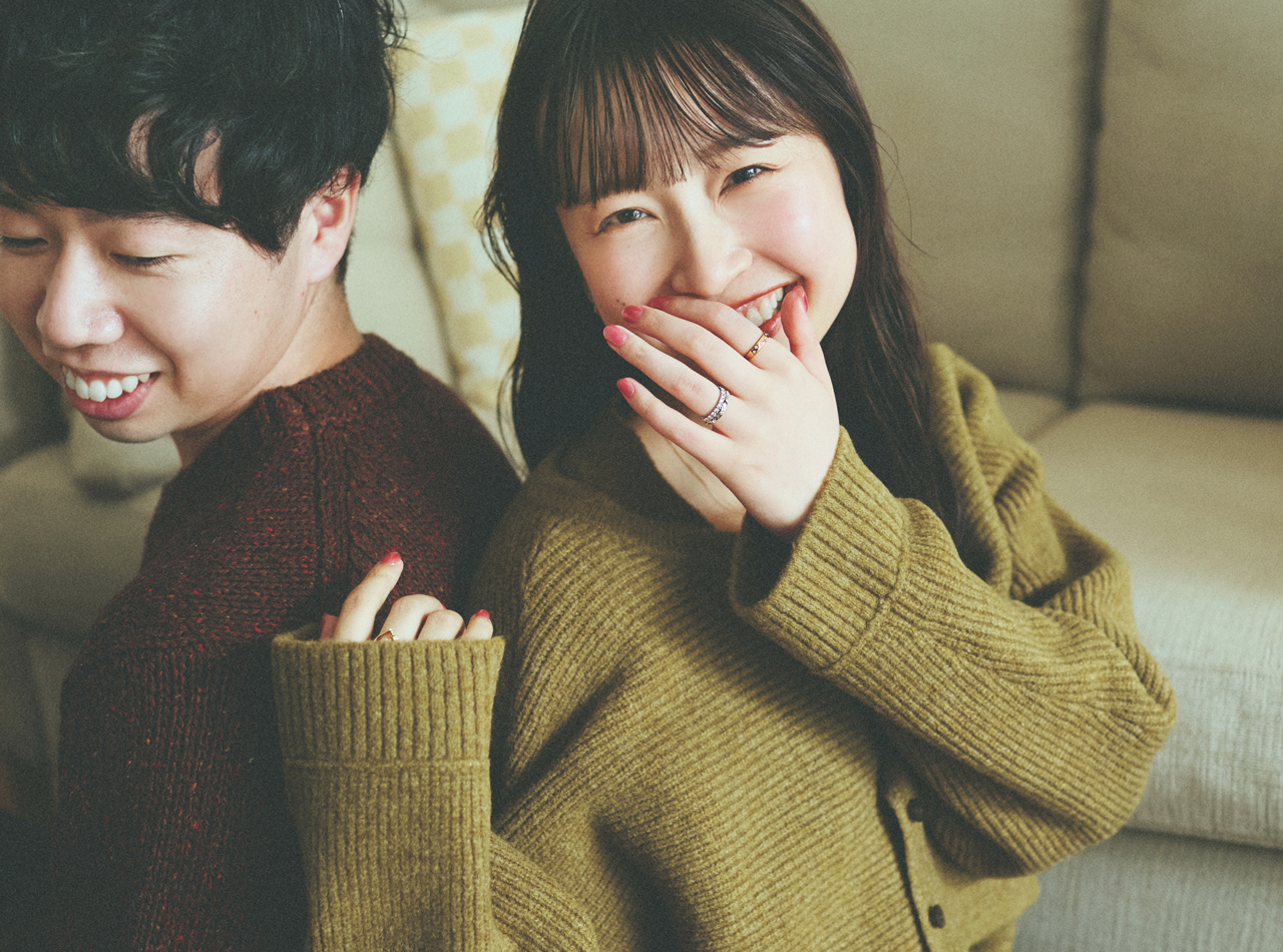 「おだやかな性格の彼との生活は、おつきあい中も結婚してからもあまり変わらなくて。ただ、愛を誓うエンゲージリングと家族になったという証明のマリッジリングが手元にあることで、安心感が大きくなりました! 休日はあまり合わないですが、ふたりの時間も大切にしながら、お互いや家族が過ごしやすい家庭を築いていきたいです。無理なくすごして、日々の小さな幸せをちゃんと感じながら生きていく。そういう地に足のついた素敵な夫婦になれたら幸せです!」