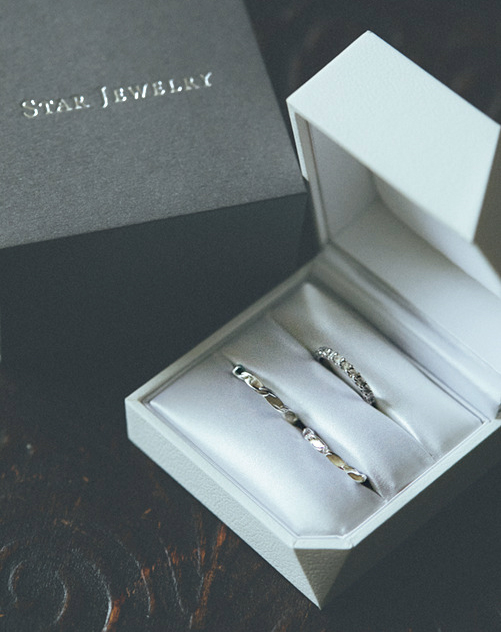 「ジュエリーに対する私のこだわりは、おつきあいの中で彼に伝わっていたので、プロポーズのときは大きな花束のみ。その代わり『一緒に婚約指輪を見に行こう』と伝えてくれました。この気使い、とってもうれしかったですね! 婚約・結婚指輪をつけるなら自分でも選びたいと思っていましたし、男性がひとりでリングを選ぶのって迷いやすく大変だと、これまでの接客経験から知っていたので。ふたりで店舗を訪れて接客してもらったときは、ワクワク胸が躍りました! 普段接客する側なので、お客さまはこんな気持ちなんだなといい勉強になった気がします。私が婚約指輪として選んだのはエタニティリング。結婚を誓った指輪、せっかくなら普段使いできるようにしたかったんです。STAR JEWELRYには永久保証制度があって、サイズのお直しだけでなくダイヤモンドの紛失保証もありますから、毎日安心してつけられるというのも後押しになりました。このリング、今も毎日つけていますが、お客さまにもほめられることが多いんです。いい選択だったなと、そのたびに思い出しています♡」