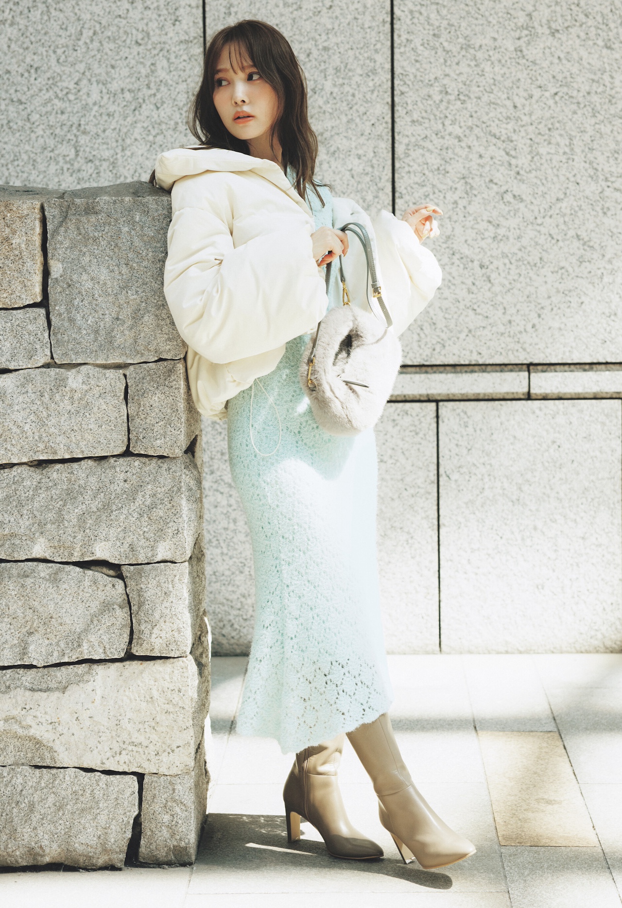 コンパクトなショート丈と全体的にころんと丸みを帯びたシルエットが愛らしい、まさにデート向きの白ダウン。優しげムード漂う起毛感のあるニットワンピは、マーメイドシルエットや程よく透け感のあるカギ針編みで色っぽさも。