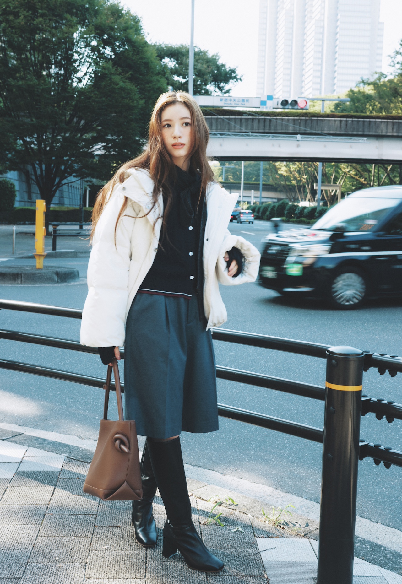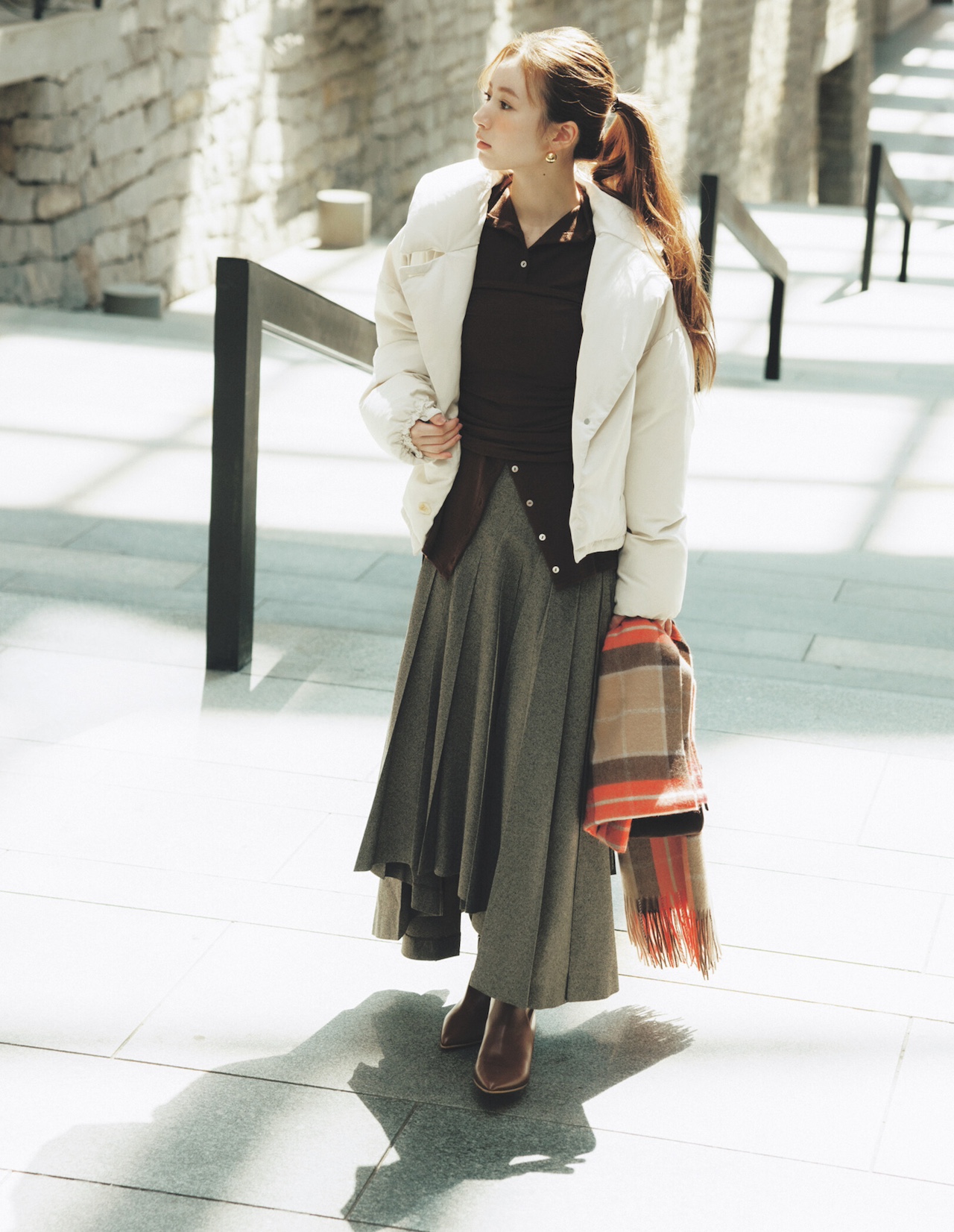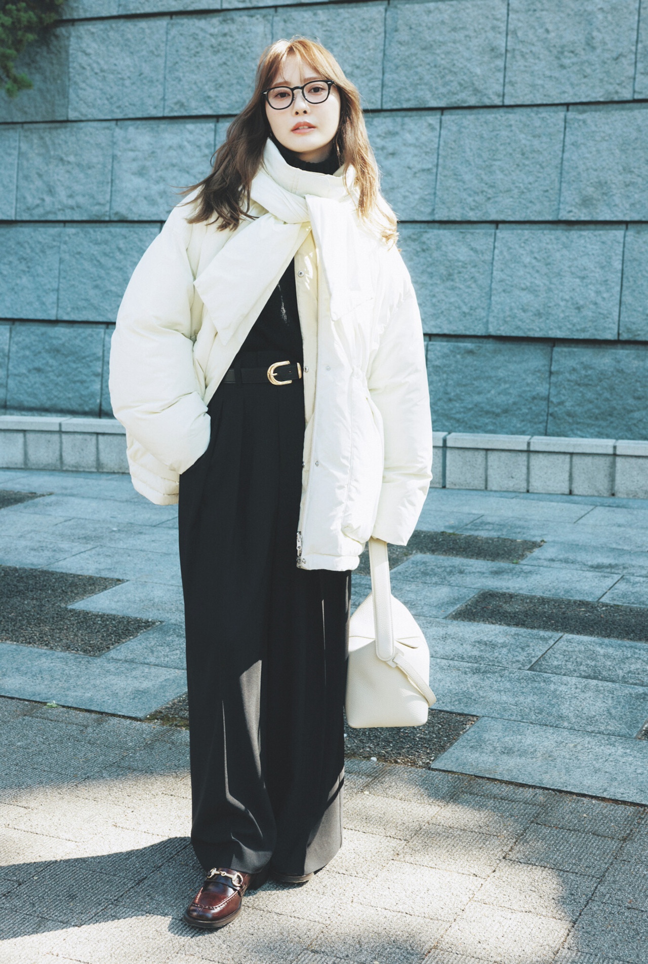 清潔感があって品よく着られる白ダウンなら、オフィスコーデにも馴染みやすい。さらに中をシックなワントーンでまとめると、大人っぽさ&洗練ムードが高まって、〝きれいなお姉さん〟な着こなしに昇華。
