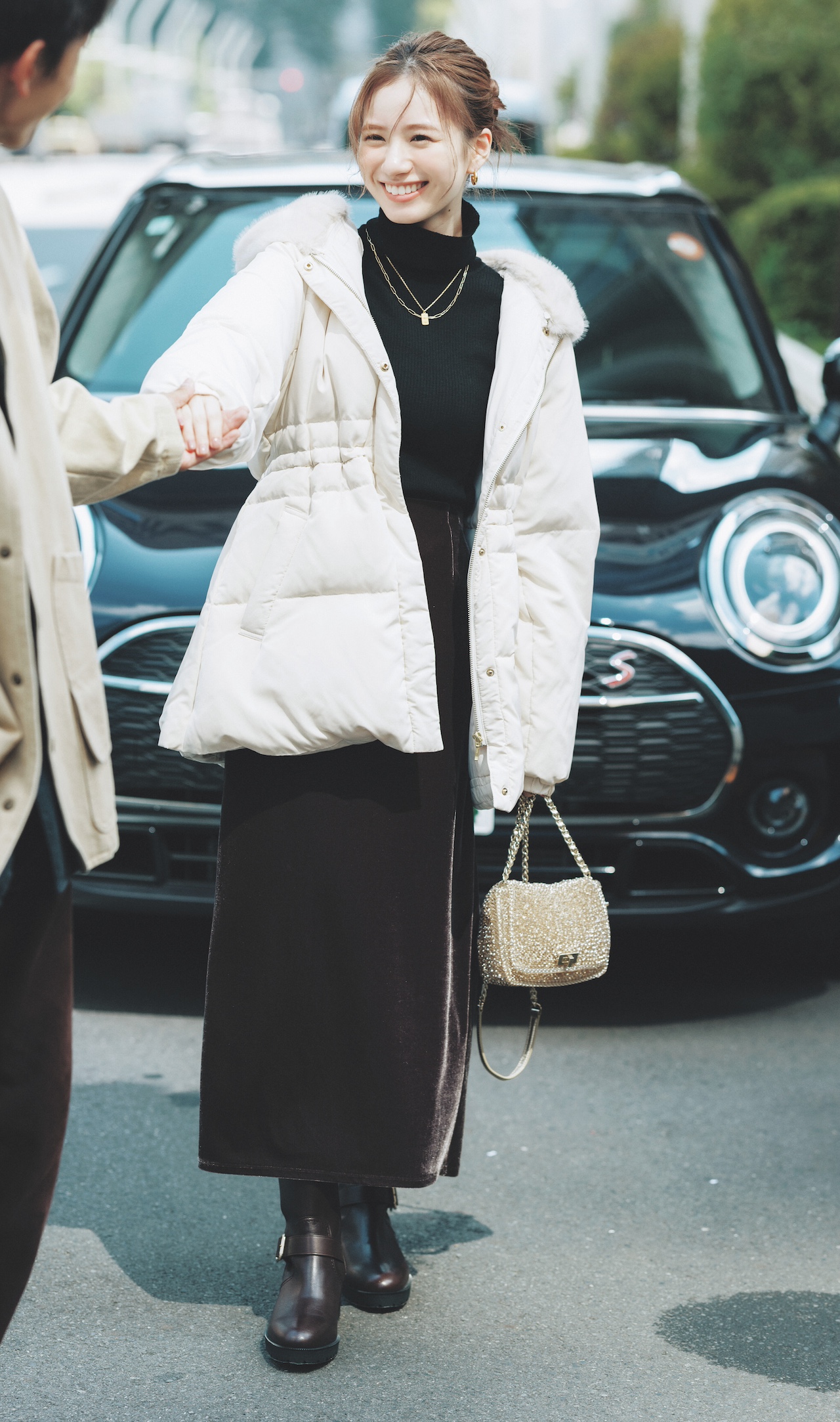 ウエスト部分にドロストが施されたダウンは、きゅっと絞ることですっきりしたシルエットに。クラシックなタートルニット×タイトスカートの組み合わせも、ベロアの品のある光沢がトレンドの洒落感とエレガントな魅力を後押ししてくれる!