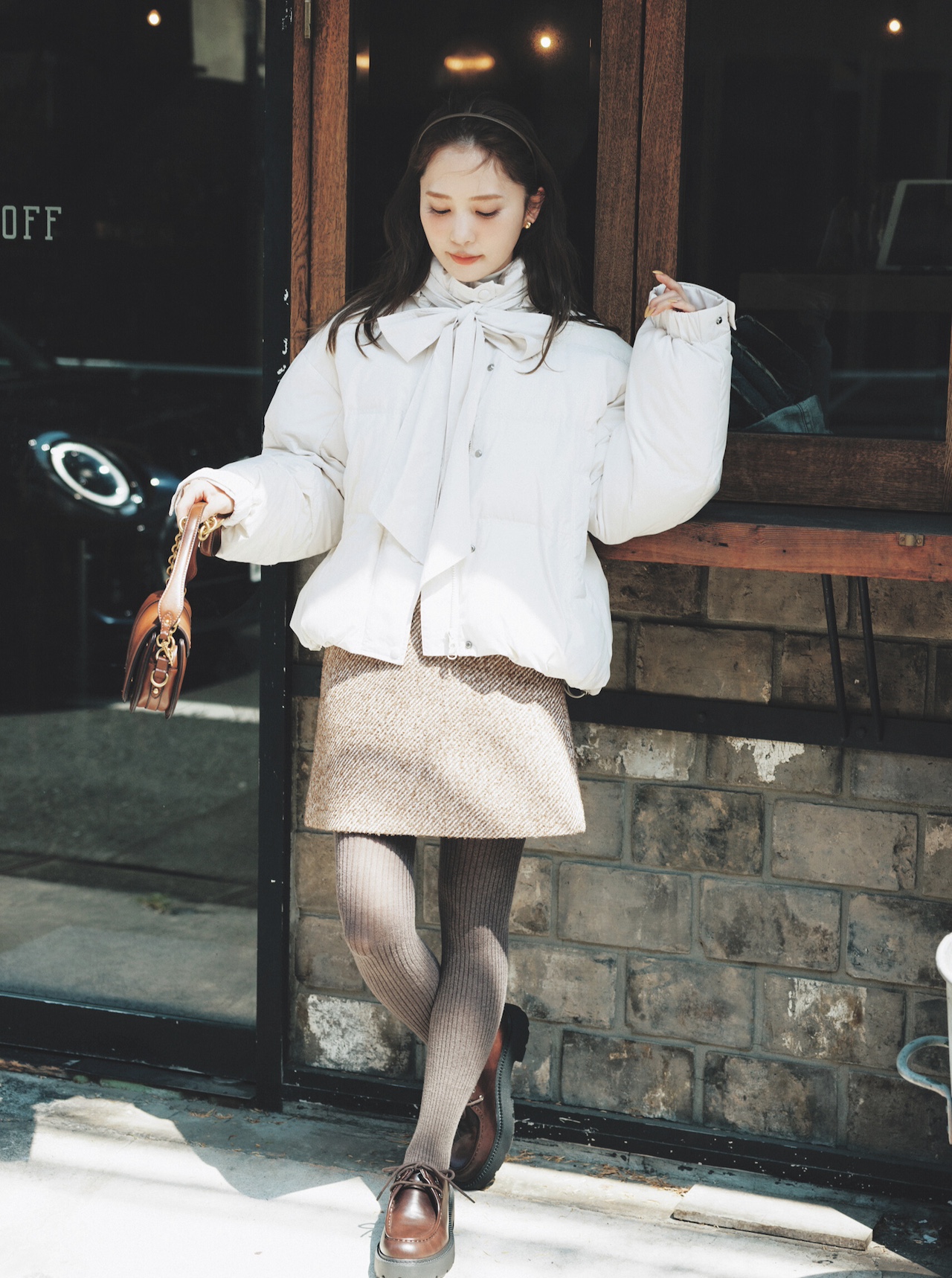 大きめのボウタイリボンを首元のアクセントにつければ、カジュアルなダウンも甘めに着られる♡ 白とまろやかに馴染むキャメルカラーのツイードミニやブラウン小物と合わせて、上品ムードをメイク。