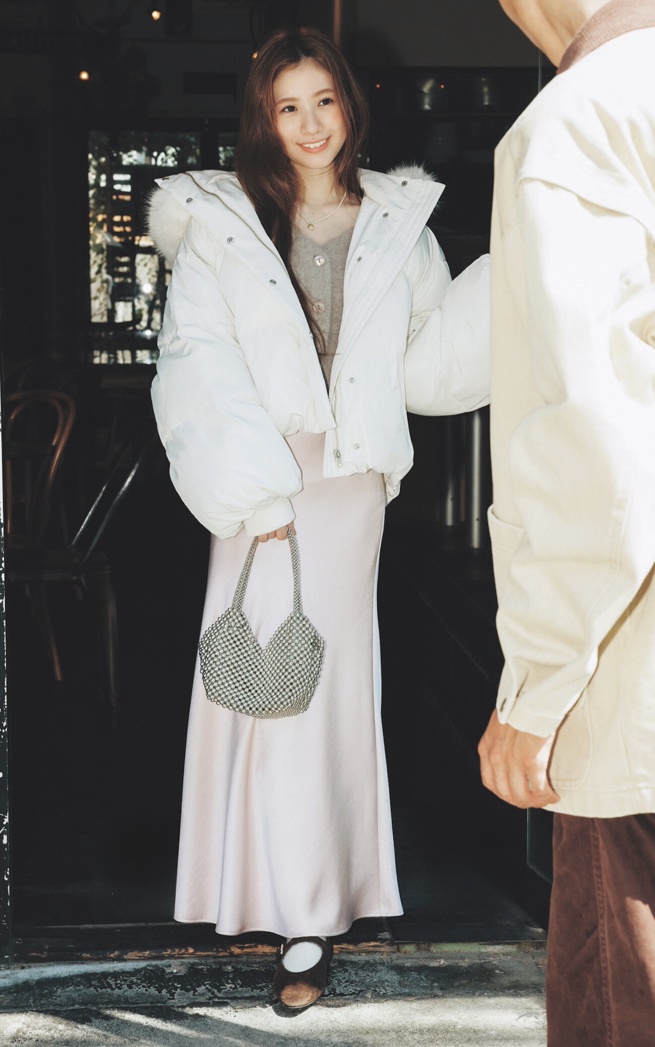 ファー付きの白ダウンが絵になるかわいさ♡ 触れたくなるモヘアニットを仕込んで、フィルター超えの効果をブースト。