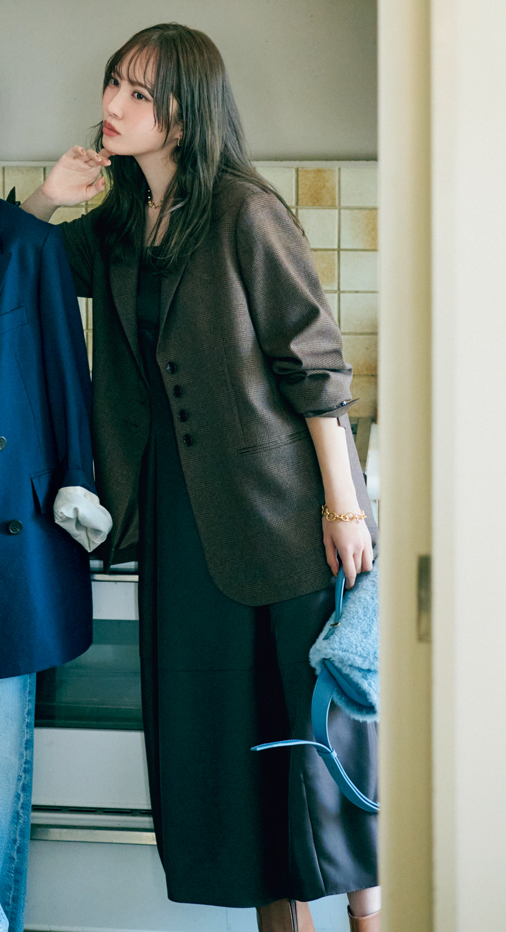 ブラウンのグレンチェック柄や高めの位置に配したボタンがクラシカルな女っぽジャケット。同系色のツヤワンピで素材感にメリハリをつけて、リッチ感漂うワントーンコーデが完成! ボアバッグやブラウンのブーツで、季節感を上乗せ。