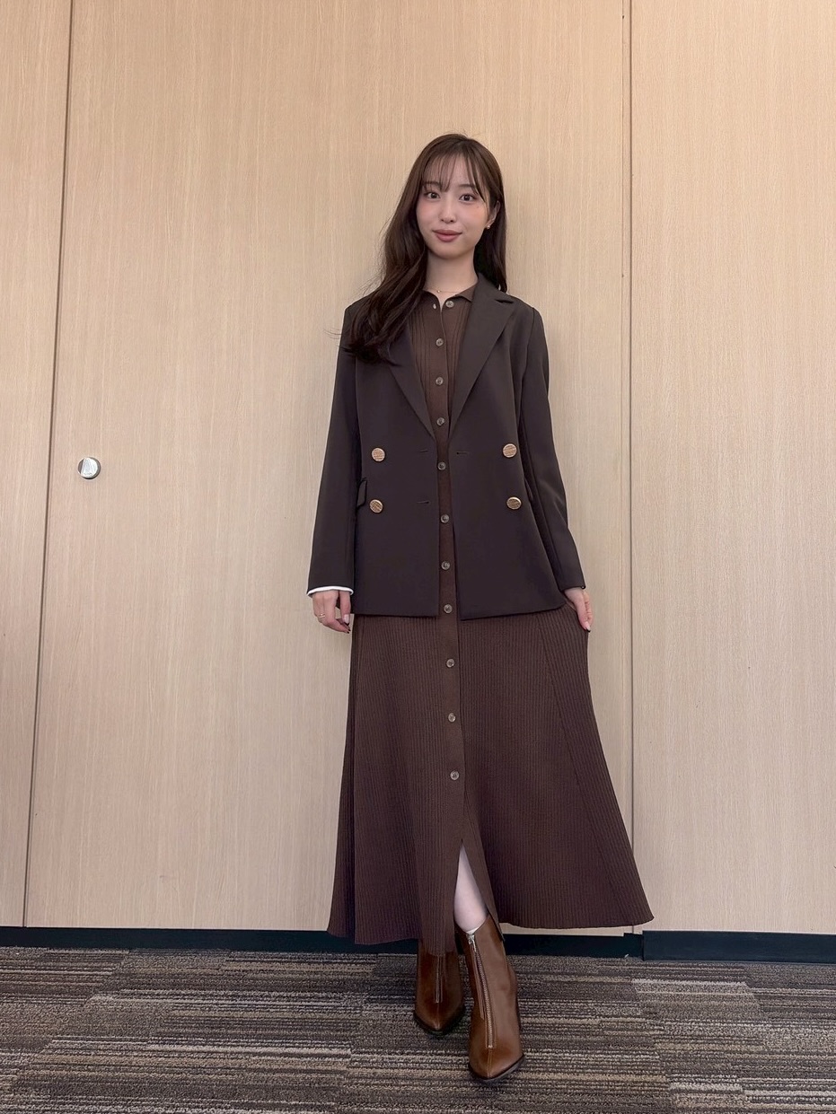 今季注目のブラウンで作る、今っぽワントーン。ダークトーンでありながらも軽やかに見えるように、ジャケットのゴールドボタンやワンピースのスリットでリズムよく。シンプルでありながらも更新感が漂う装いに。