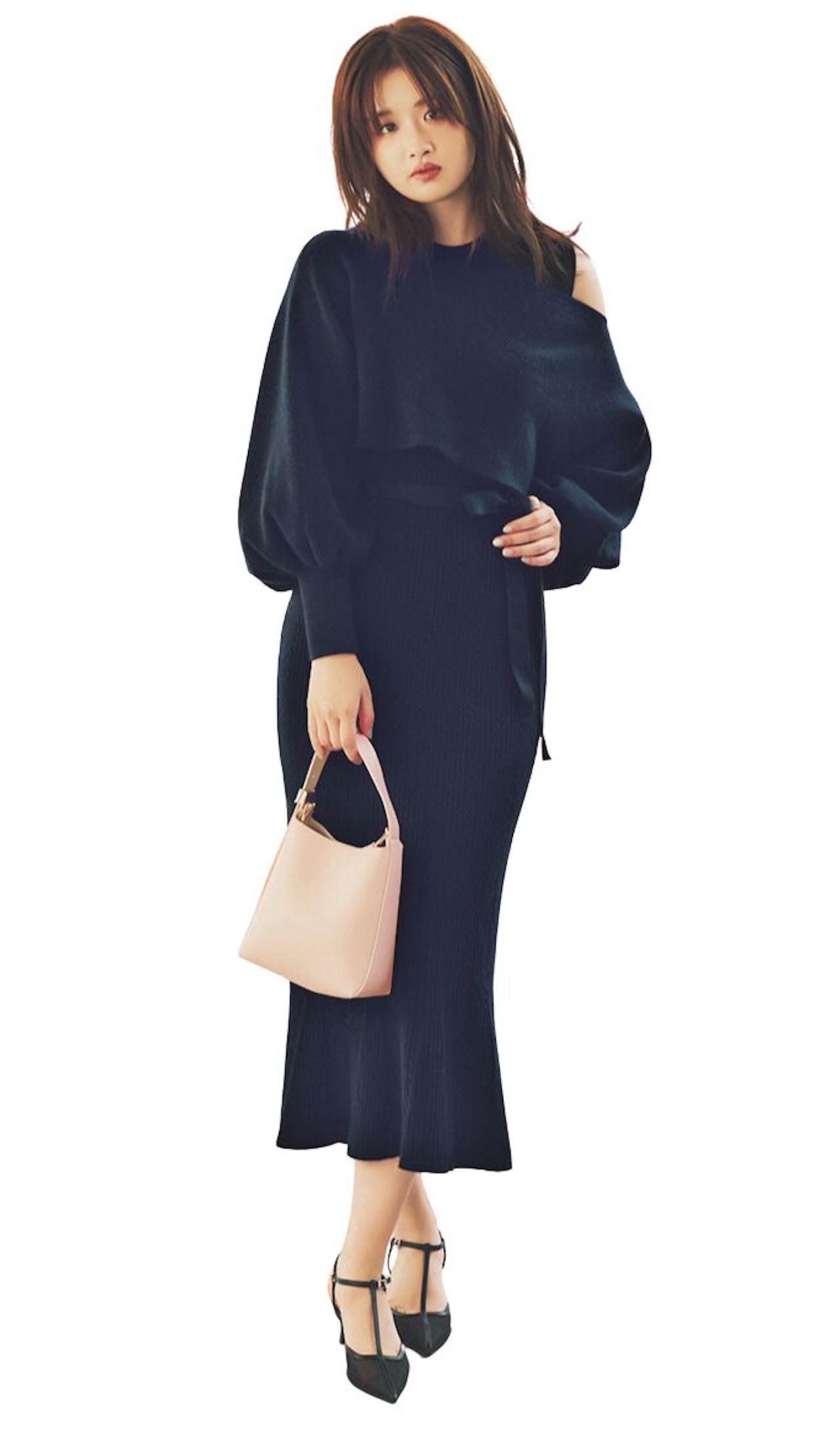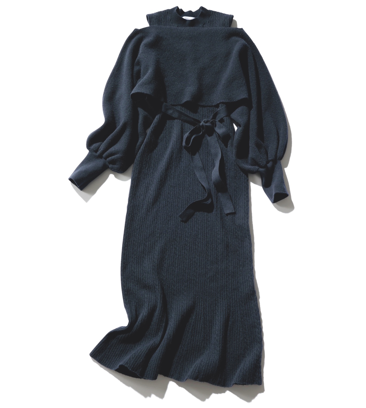 ふわっとボリュームスリーブニット、ウエストマークするリボンベルト、マーメイドラインの裾などのイイ女ディテールが、スタイルアップを確約! ニットワンピはケーブル模様の編み地で、同色レイヤードでものっぺり見えない。肩を落とす肌見せ具合も、シーンに合わせて楽しみたい。