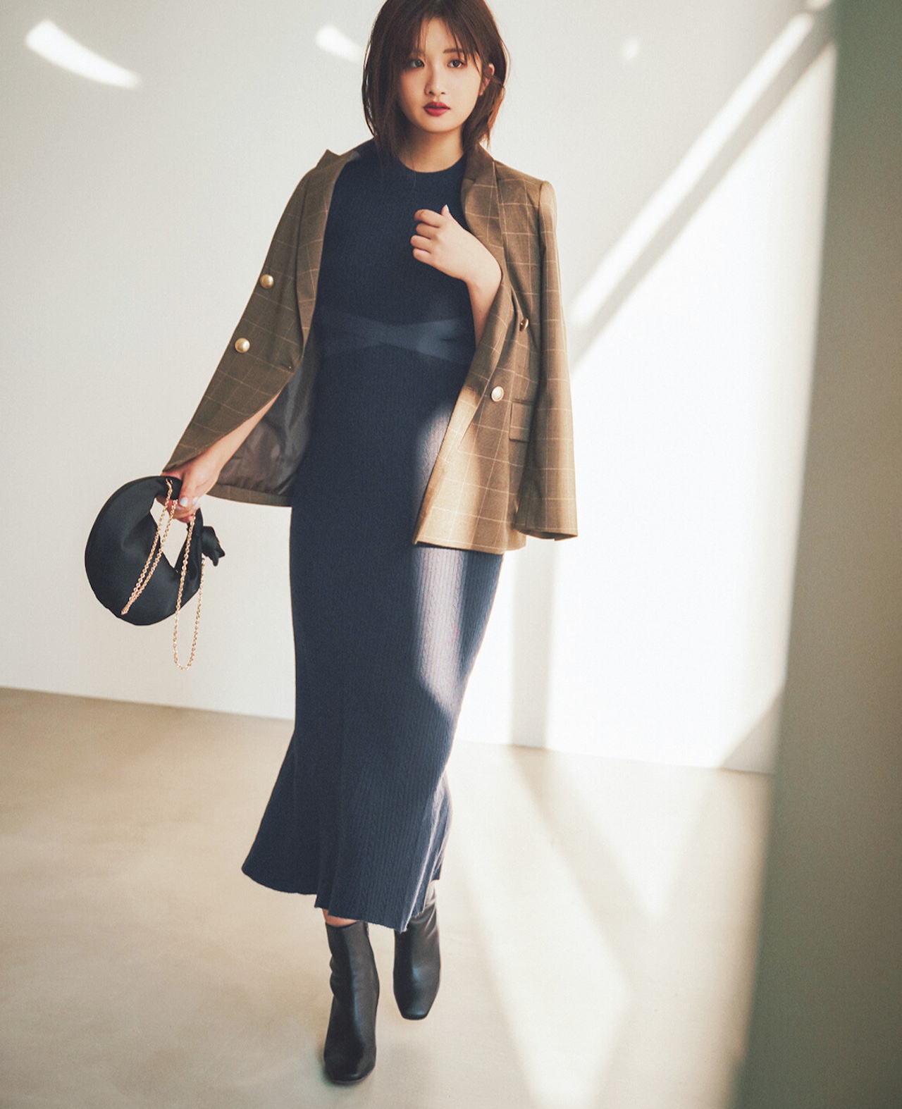 ワンピース/静物と同じ、手に持ったジャケット¥33,000(AKTE)、バッグ¥45,100(ヴァジックジャパン<VASIC>)、靴¥15,180(バロックジャパンリミテッド<マウジー>)、靴下¥990(タビオ<靴下屋>)