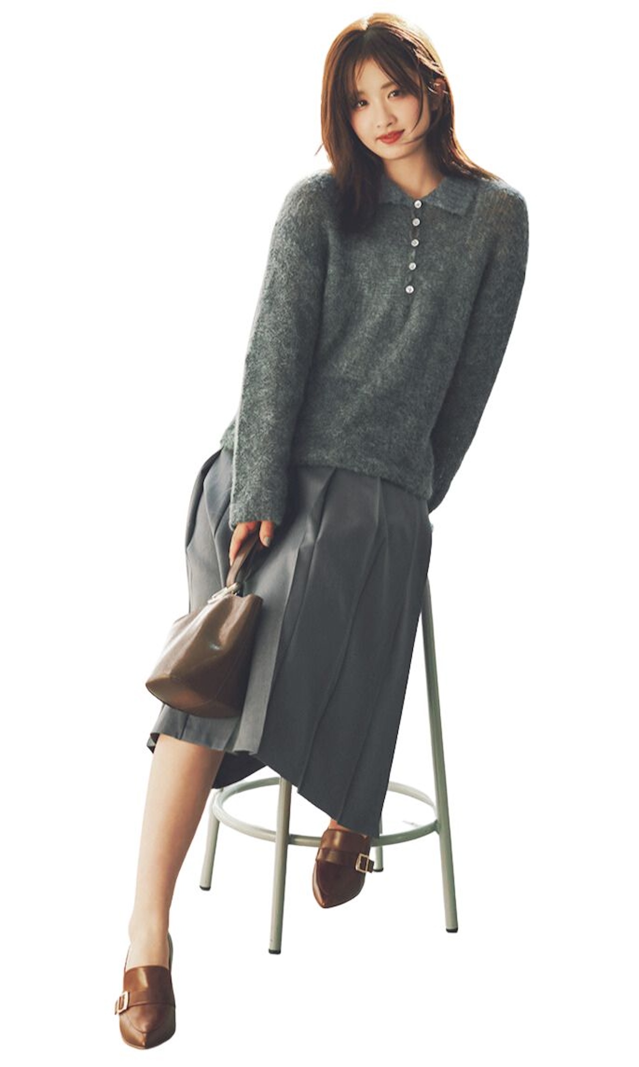 秋冬になると恋しくなる、ポロ襟ニット×ミディ丈プリーツスカートの上品クラシカルな装い。シックなグレーワントーンがボヤけないように、小物でつやブラウンを差してメリハリづけを。