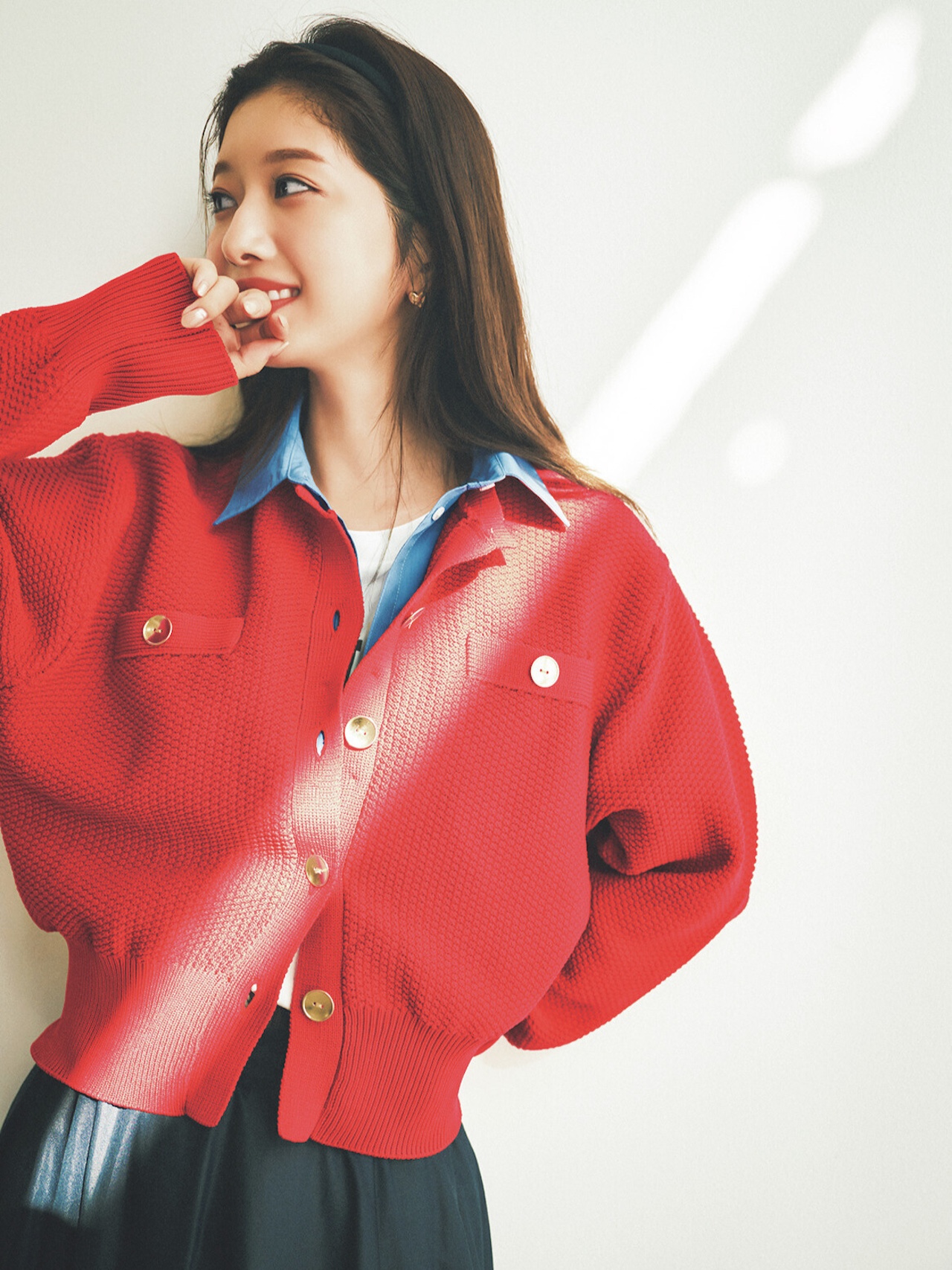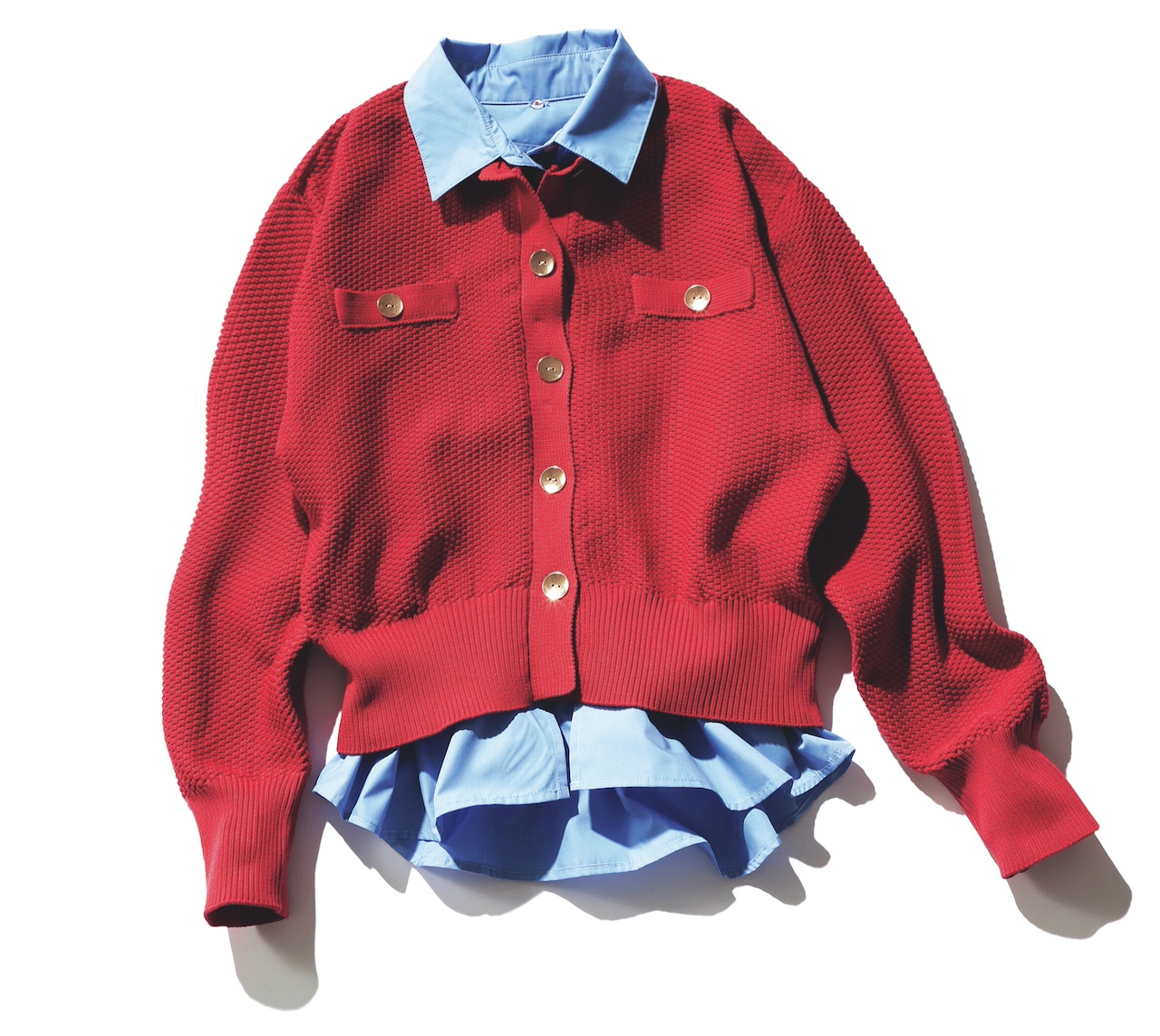 ブルーシャツを重ねたように見えるカーデ。シャツの襟元と裾は、ボタンで取り外し可能。「明るい赤が写真映えしそうで、女子会へ着ていきたい。チクチクしない着心地も、ニットを選ぶ基準!」(若山莉久さん)