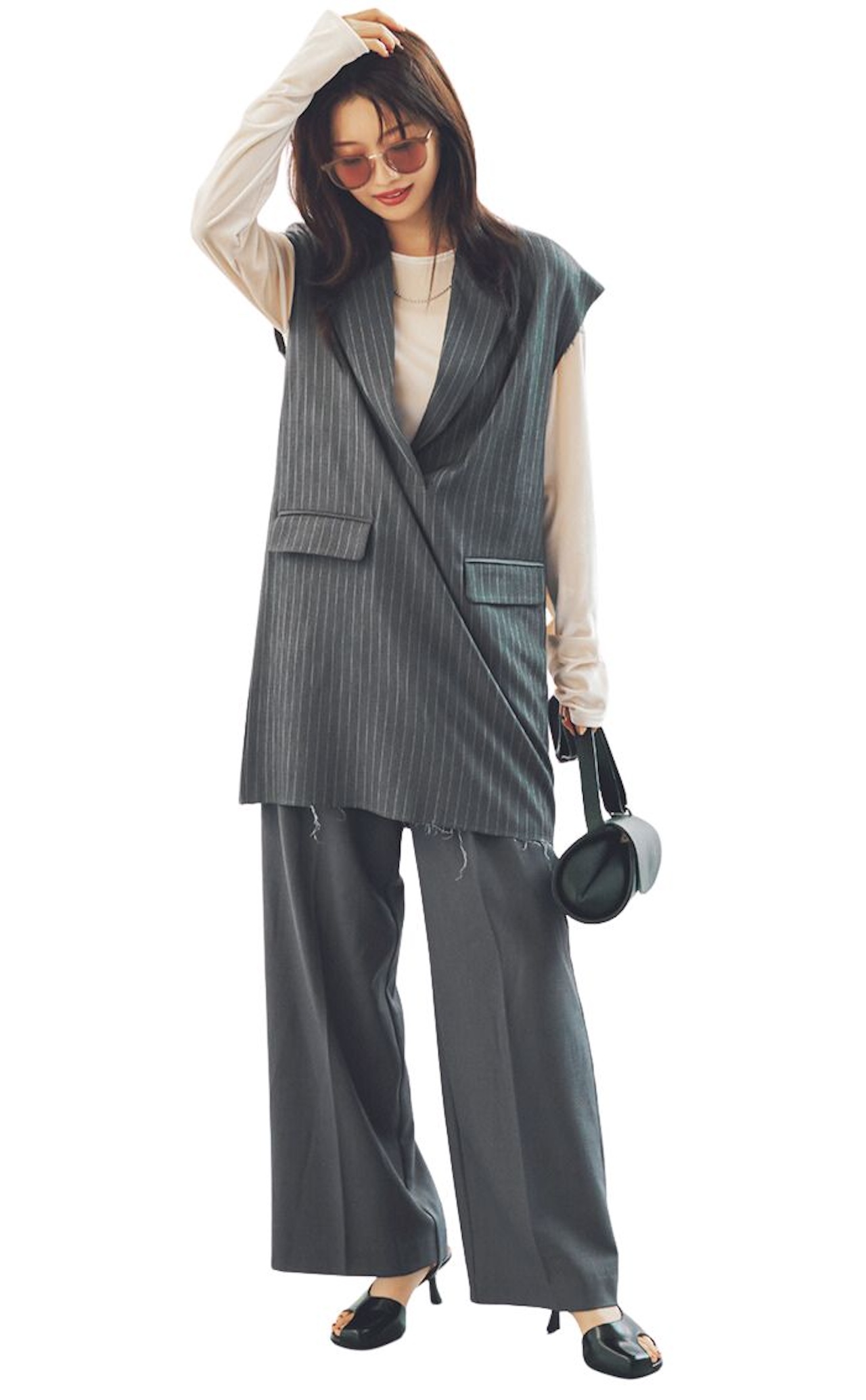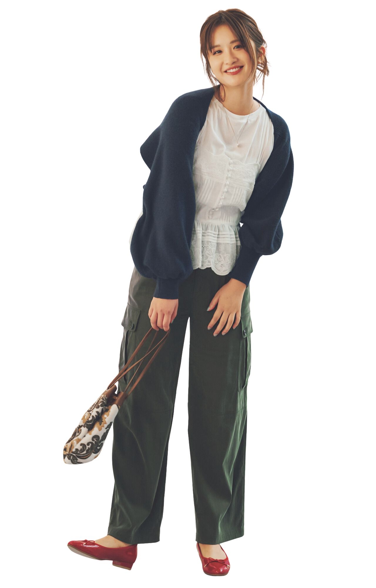 カーディガン/静物と同じ、ブラウス¥18,150(アメリヴィンテージ<アメリ>)、パンツ¥9,900(シップス<シップス エニィ>)、バッグ¥44,000(ヴァジックジャパン<VASIC>)、靴¥25,300(ダニエラアンドジェマ)