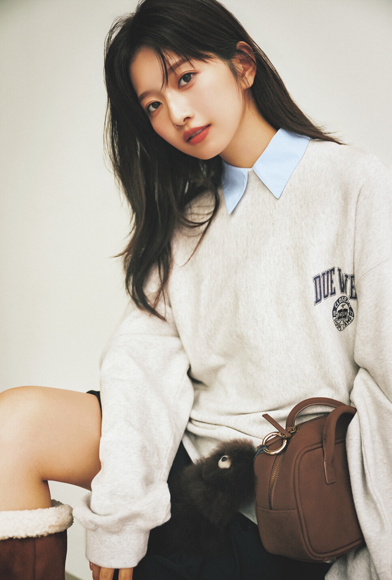 シャツ襟/静物と同じ、スエット¥9,350(Ungrid)、スカート¥8,690(dazzlin)、バッグ¥2,990(GU<GU>)、バッグに付けたチャーム¥4,950(シップス<コージー>)、靴¥14,900(CHARLES & KEITH)
