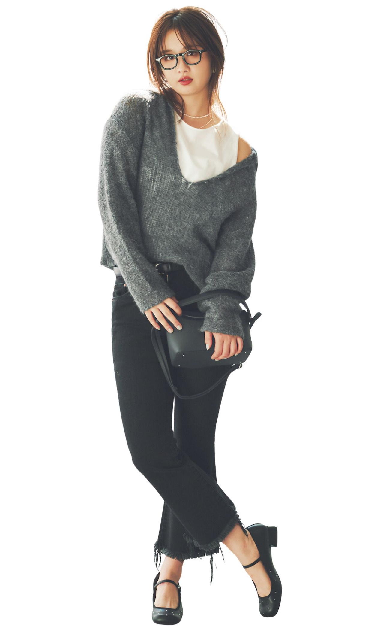 ニット/静物と同じ、タンクトップ¥8,250(アンタイトル)、パンツ¥25,300(ゲストリスト<レッドカード トーキョー>)、バッグ¥47,300(ヴァジックジャパン<VASIC>)、靴¥22,000(ダニエラアンドジェマ)、メガネ¥46,200(アイヴァン 東京ギャラリー<アイヴァン>)、ベルト¥14,850(セムインターナショナル<AULENTTI>〉、ネックレス[長]¥11,000・[短]¥8,800(ココシュニック<ココシュニック オンキッチュ>)