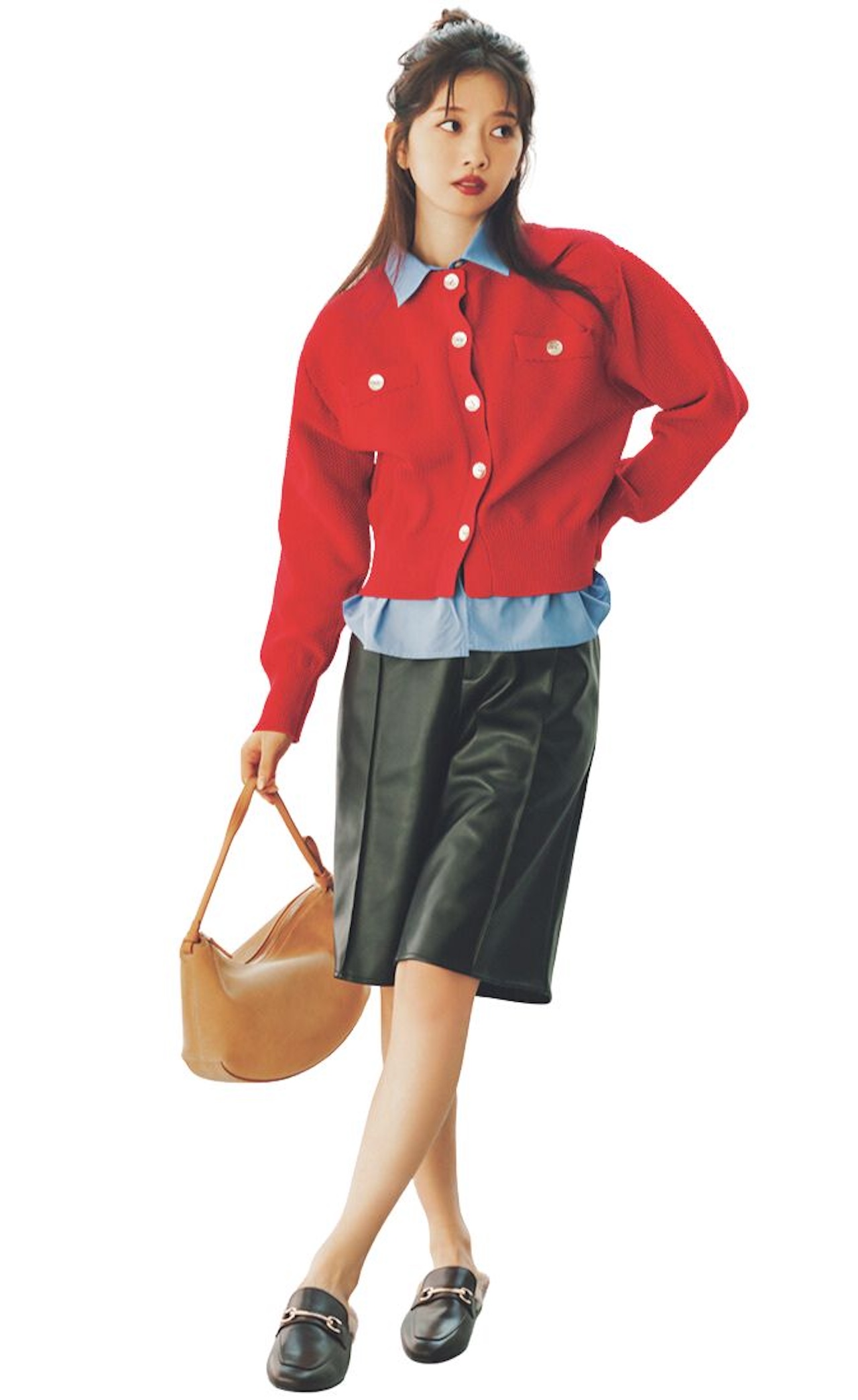 襟と裾を取り付けると、カーデだけでもコーデ力がたちまちUP! 辛口レザー風ハーパンを合わせれば、人と差がつくモードな空気が漂って、上品顔の赤カーデをさらに新鮮に着られる。ポケット風デザインや金ボタンも、華やか見えのアクセントに!