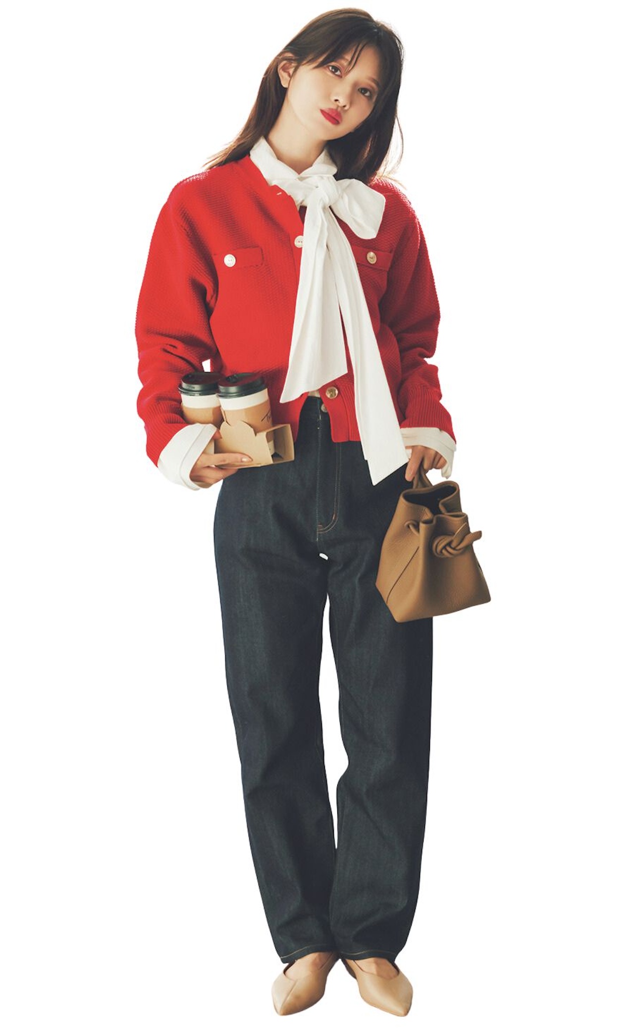 ブルーのシャツ襟と裾を取り外し、ボウタイブラウスをIN。鮮やかな赤カーデと相性がいいリジットデニムをボトムに選べば、クラシカルさを残しつつ、コンサバ見えしない親しみやすい仕上がりに。
