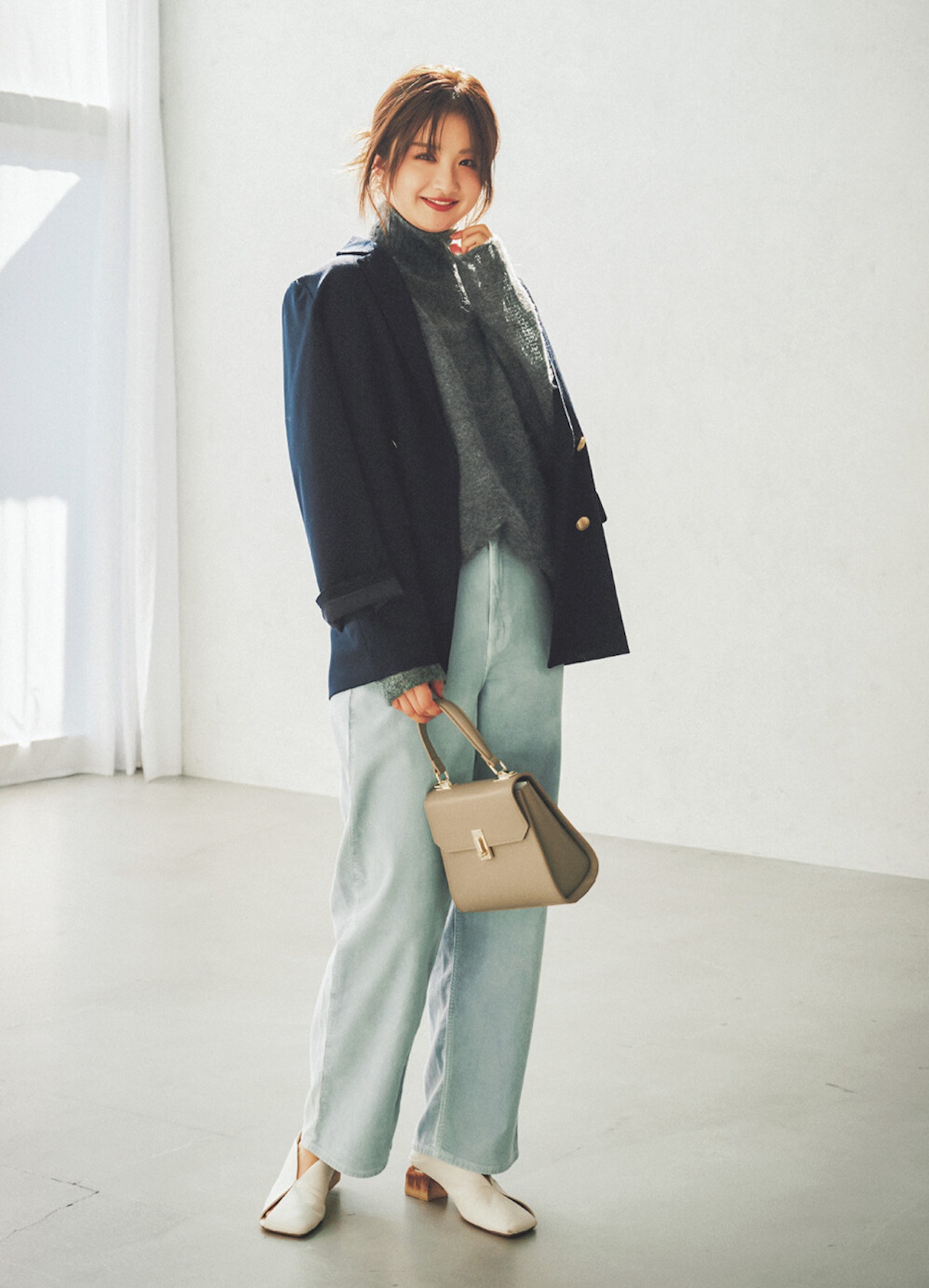 ジャケット着用のきちんとめコーデには、襟元を立てつつボタンを背中側に回して、シンプルなハイネックニットとして着用。アルパカ混ニットのふわふわした質感や淡ブルーパンツのコーデュロイ素材で、シーズンムードを高めて。