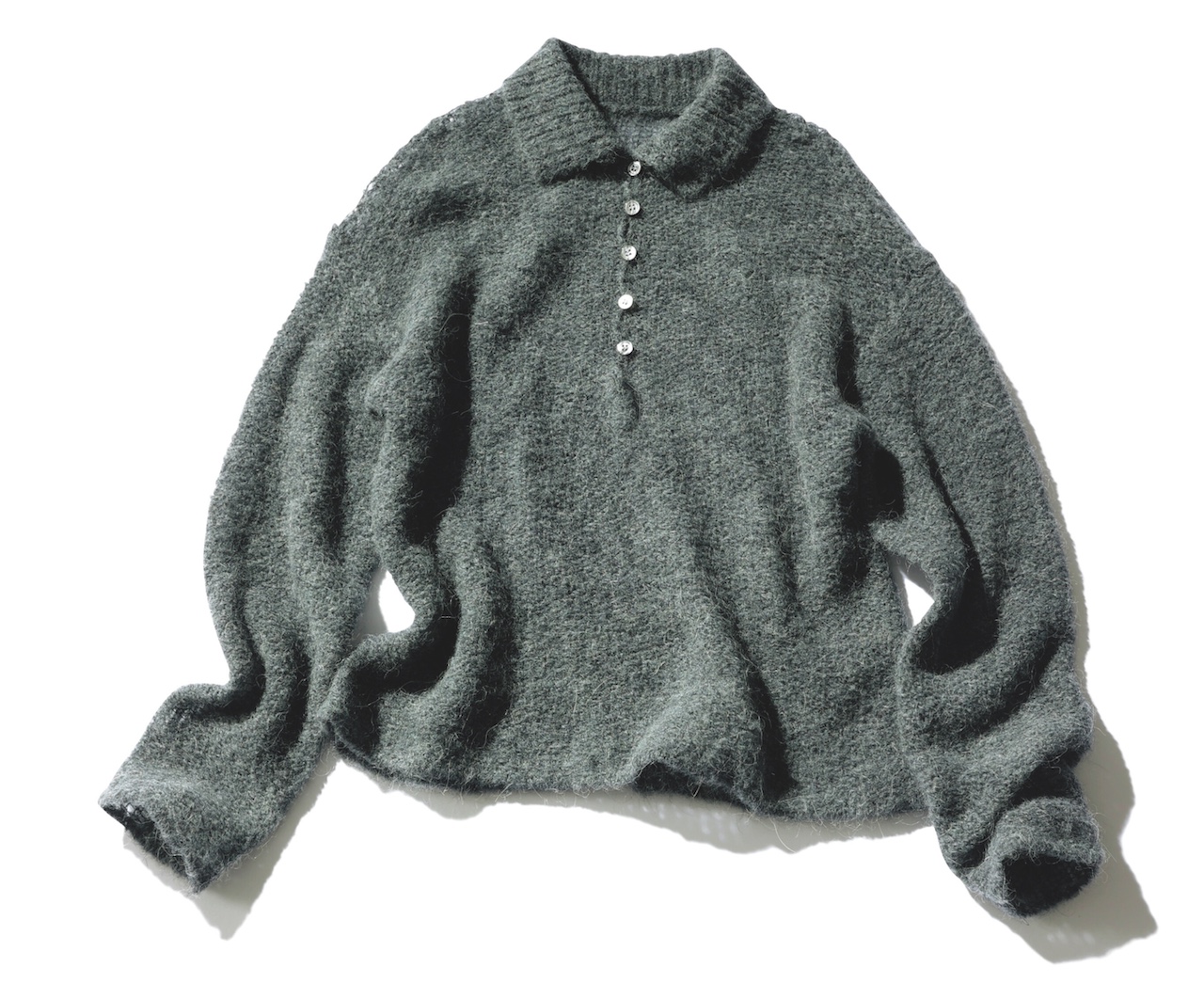 ハイネックから肌見せまで、イメージが激変! キャラを超えたアレンジができるポロ襟が秀逸。「一見真面目なポロ襟ニットが、色っぽ肌見せニットにもなるなんて感動! 真冬は、中にタートルを重ねたい」(入山七菜さん)