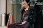 ブラウンのレザージャケットでフリルワンピにキレ味を