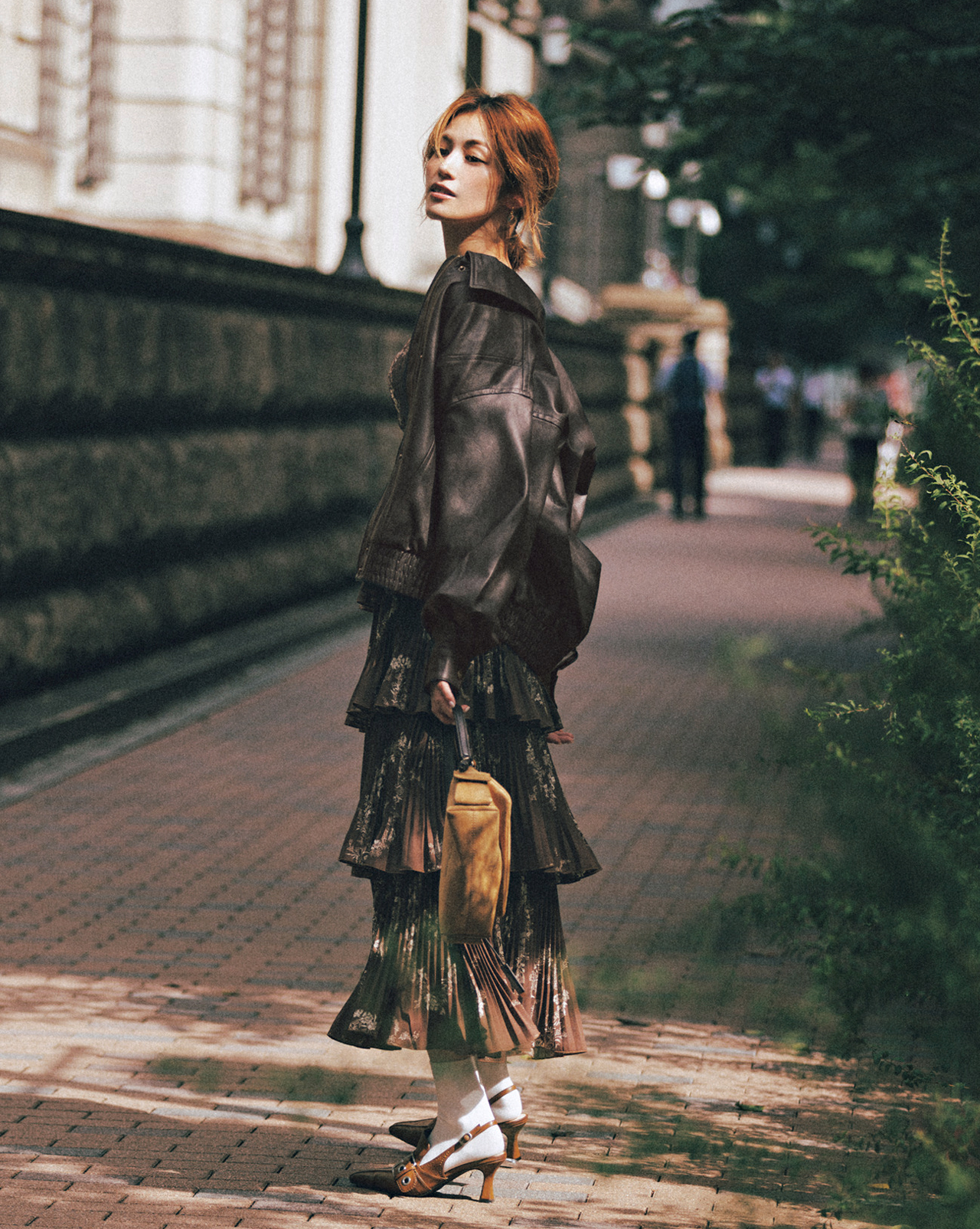 ティアードフリルにボタニカルプリントが華やかなワンピは、全体を秋らしい深みのあるブラウンでまとめてシックに。ややオーバーサイズのレザー風ジャケットをゆるっとはおるのも、甘さを抑えて大人っぽく見せるポイントです。