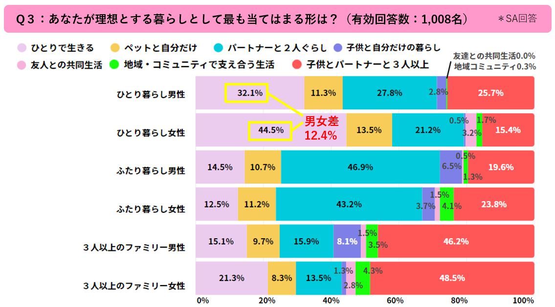 すべての世帯において現在の自身の暮らしが理想と回答した人が多数派ではあるものの、5割未満となりました。そして半数の人は現在の暮らしが理想のかたちではないと感じている様子。特にひとり暮らし世帯では、「ひとりで生きる」が理想と回答した女性が44.5%に対して、男性は32.1%と、他の世帯よりも差が大きくなりました。