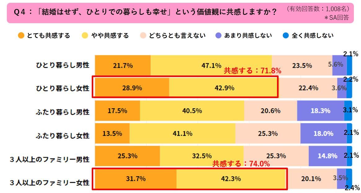 全体の半数以上が共感すると回答しており、結婚せずひとりで生きるという価値観への理解が浸透していることが分かります。特に、共感すると回答した割合が高い属性では、ひとり暮らし女性の71.8%を上回り、3人以上のファミリー世帯女性が74.0%となりました。ふたり暮らしの女性を除くと、女性の方が「ひとりでも幸せ」と感じやすいのかもしれません。