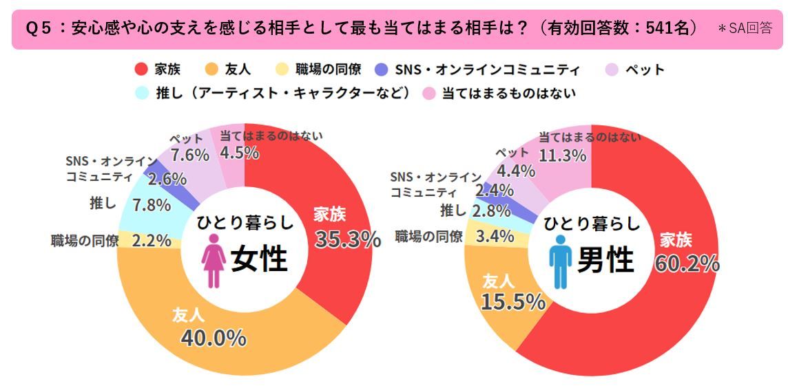 心の支えになっている相手として最も当てはまる相手を1つだけ選択してもらったところ、男性では「家族(60.2%)」が最多となった一方、女性は家族と僅差で「友人(40.0%)」が最多回答となりました。