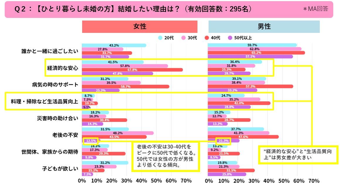 女性は「経済的な安心」が最も高く、男性では「誰かと一緒に過ごしたい」が最多理由となりました。