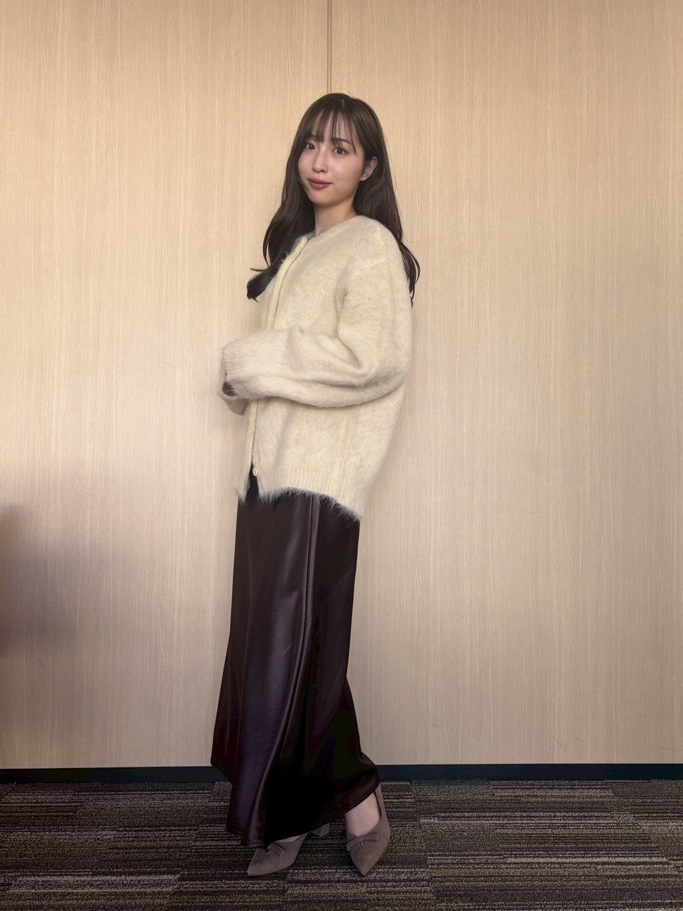 袖から見えるシャギーニットで冬のムードを高めて【林さんのシャギーニットカーデ着用画像8枚】