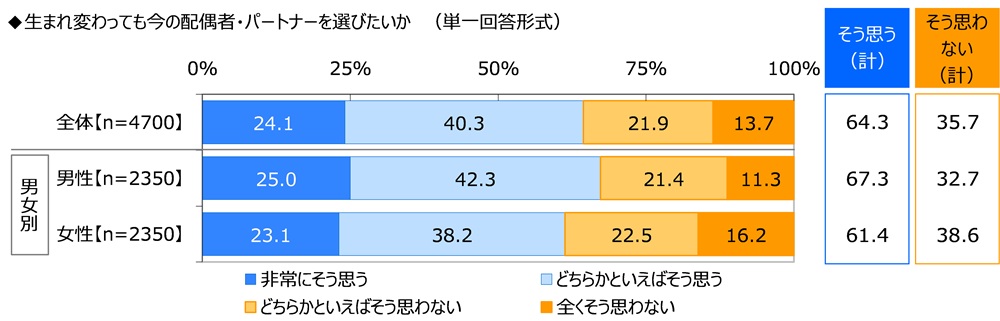 そこで、生まれ変わっても今の配偶者・パートナーを選びたいかを聞いたところ、「非常にそう思う」が 24.1%、「どちらかといえばそう思う」が 40.3%。合計した “そう思う派”は64.3% にのぼり、約3人に2人が「生まれ変わってもこの人と一緒にいたい♡」 と感じているようです。