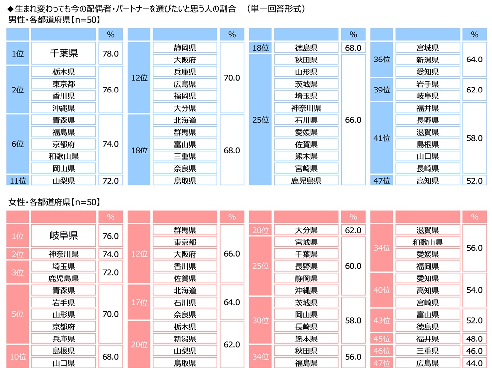 全国で“生まれ変わっても今のパートナーを選びたい”が最も高いのは…男性「千葉県」、女性「岐阜県」