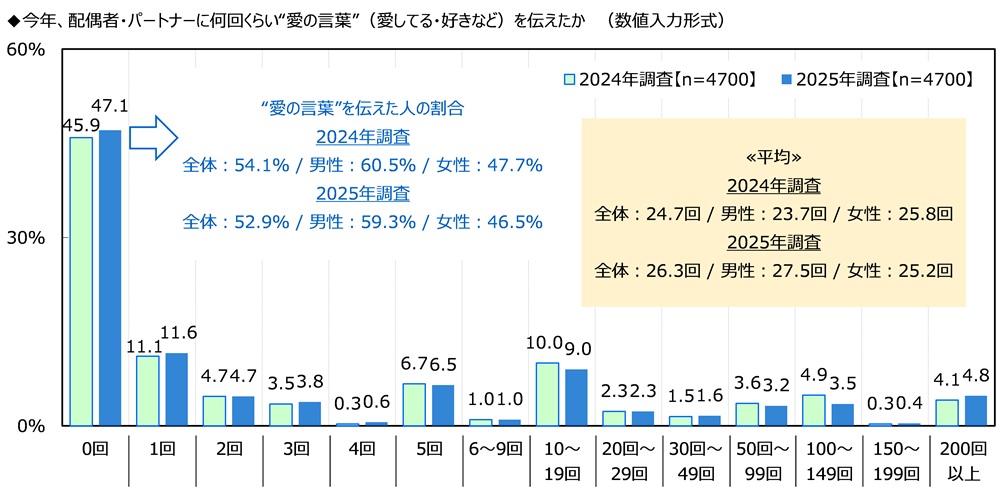 昨年の調査と比較すると、愛の言葉を伝えた回数の平均は、2024年の24.7回から2025年は26.3回へと1.6回増加。ところが、愛の言葉を伝えた人の割合は、2024年54.1%から2025年52.9%へと下降
