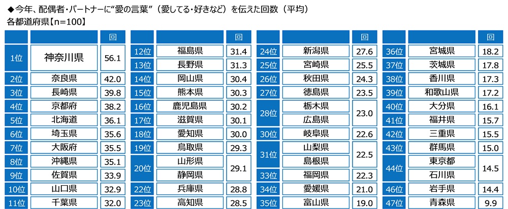 全国で愛の言葉を伝える回数が最も多いのは…「神奈川県」