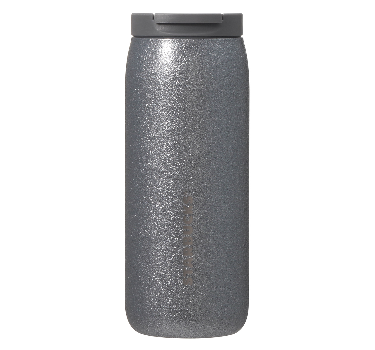 落ち着いたグレーに、繊細なグリッターの輝きをまとったステンレスボトル。上品な輝きと、缶を思わせる形状が特徴的!
