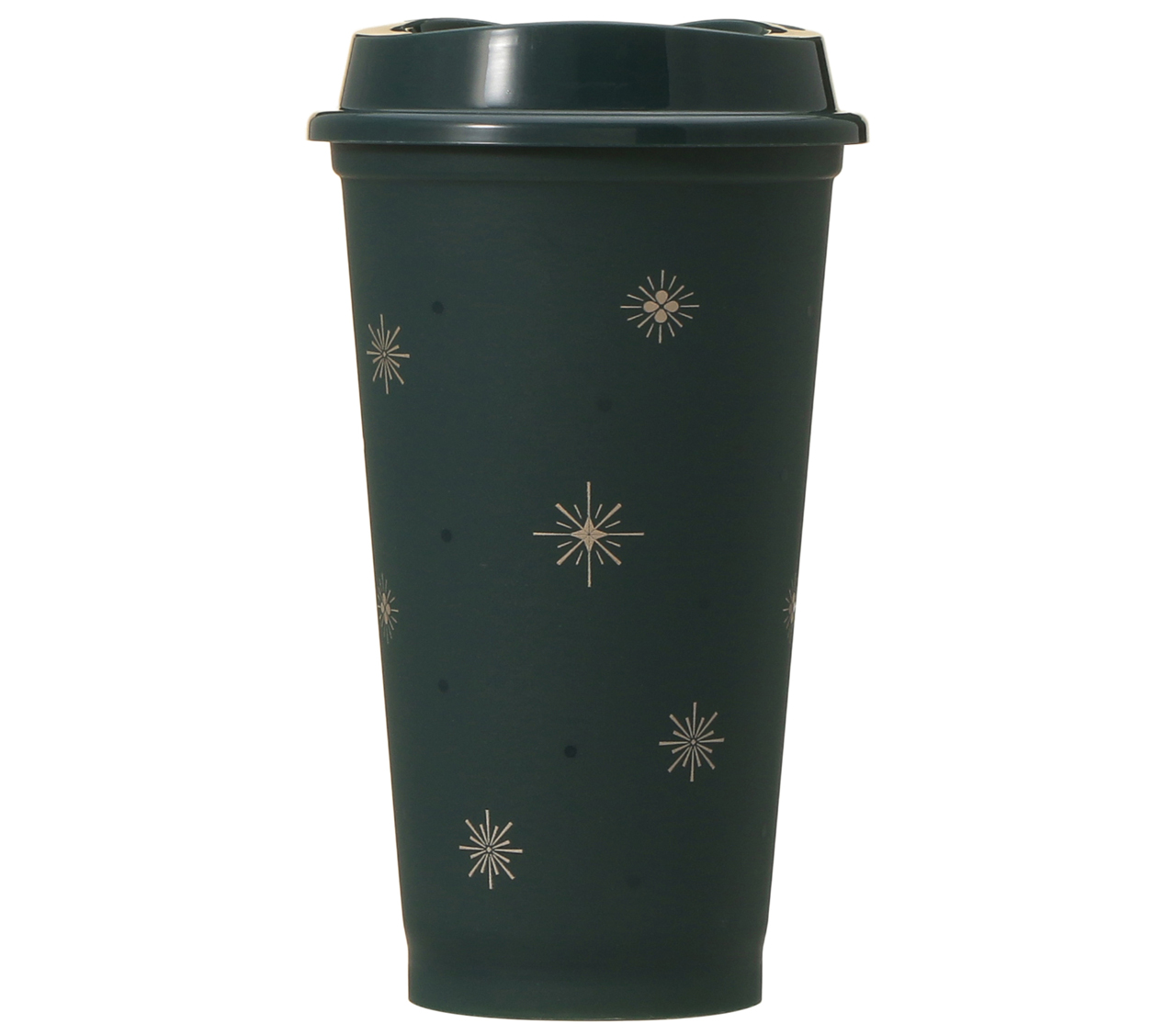 シックで落ち着いたグリーンの本体に、シーズンのきらめきをゴールドのモチーフで表したリユーザブルカップは、ほっと落ちつきたいホリデーのコーヒーシーンにぴったりの仕上がり!