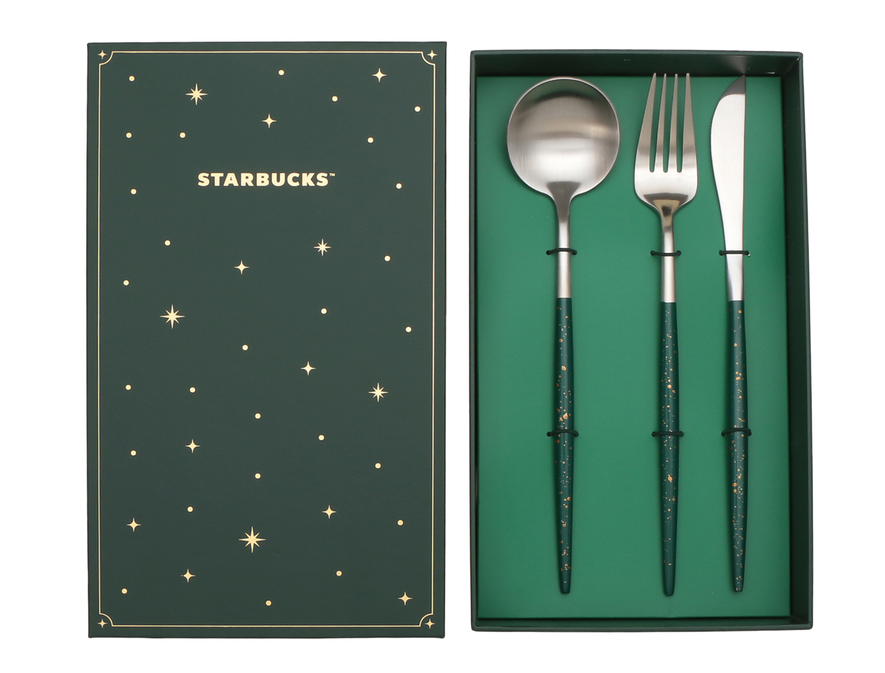 深みのあるグリーンの持ち手に、上品なゴールドが映えるステンレスカトラリーセットです。スプーン・フォーク・ナイフの3本が、特別感あるグリーンとゴールドのボックスにIN。ホリデーシーズンの贈り物にもぴったりです。