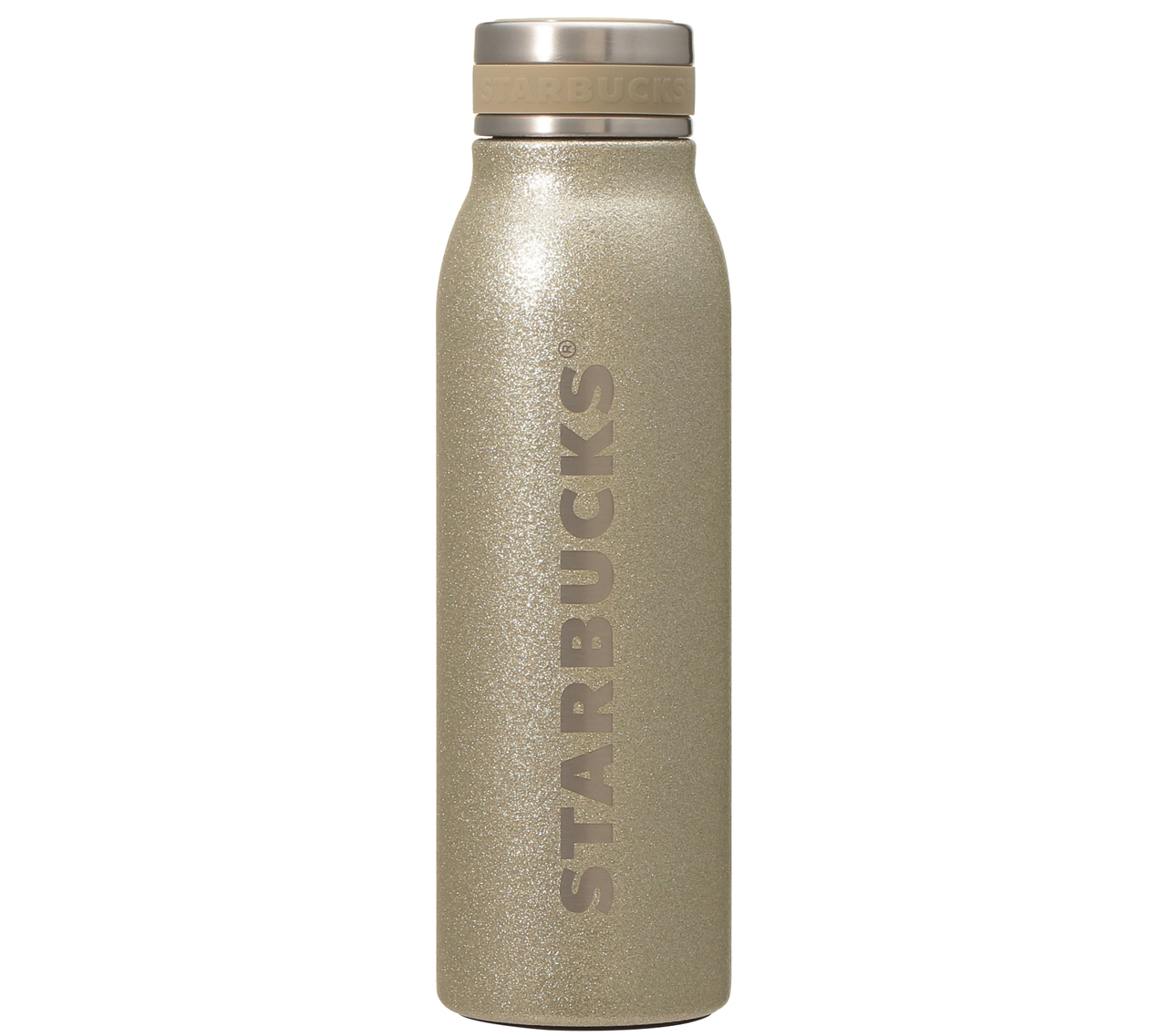 繊細なゴールドグリッターの輝きをまとったステンレスボトルは、控えめながら上品な印象。STARBUCKSのロゴがレーザー加工で表現されたタイリッシュなデザインです。