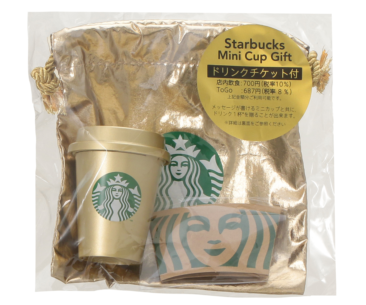 ドリンクチケットとメッセージが書けるスリーブがついたカップ型のメッセージギフト。ミニカップは小物入れとしても使用可能で、コレクターも多いアイテム。本体や巾着はシャンパンゴールドで、ホリデー気分が盛り上がる!