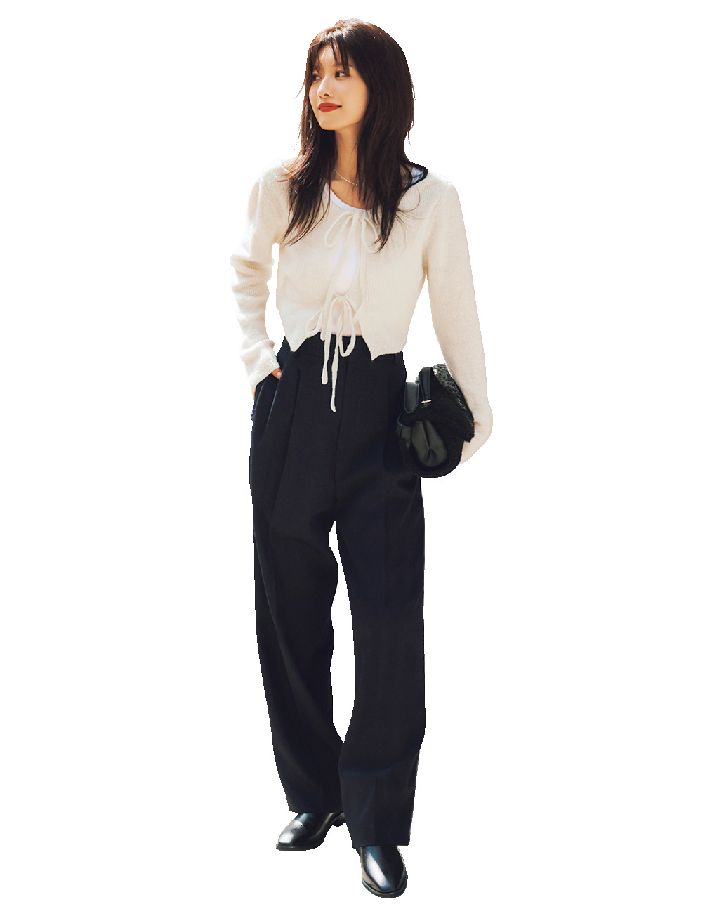 短丈カーデをネイビーのタックパンツに合わせて、簡単にきれいなお姉さん的コーデができあがり。リボンの結び方で、カーデのシルエットを調節できるのも◎。小物は黒でまとめて、しごでき感を上乗せ。