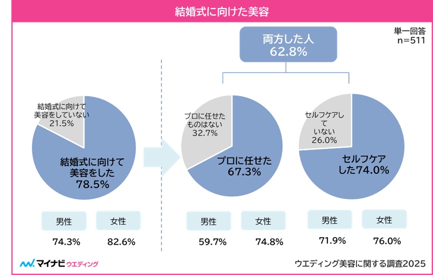 まず、結婚式に向けた美容関連の取り組みについて78.5%が「した」と回答。男女別にみてみると、女性は82.6%と多い傾向ですが、男性も74.3%もの人が結婚式に向けて積極的に自分磨きをしている結果となりました♡
