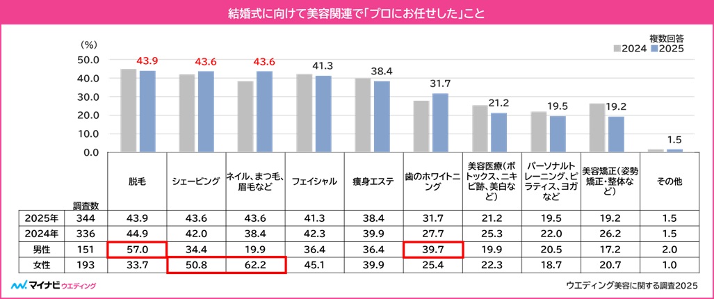 そして興味深いのは、女性よりも男性の方が多くお金をかけている傾向が見られること。これまでは女性のための特別な準備とも捉えられていた「結婚式に向けた美容投資」ですが、男性の美意識も確実に高まってきていることがデータからもうかがえます。