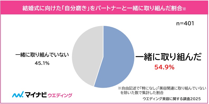 これまで男女別の自分磨きについて見てきましたが、最近ではパートナーと一緒に自分磨きを楽しむ人が増えています。今回のアンケートでも半数以上の人が「パートナーと一緒に美容関連の取り組みをした」と回答し、ふたりで一緒に理想の姿を目指していた様子♡