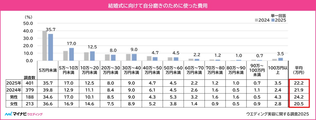 結婚式に向けて“自分磨き”のために使った費用は、男性24.2万円、女性20.5万円で平均22.2万円。一見すると結構な金額に思えますが、実際には「5万円未満」(35.7%)が最も多く、次いで「5万~10万円未満」(17.0%)、「10万~20万円」(12.5%)となり、投資額には個人差があるようです。