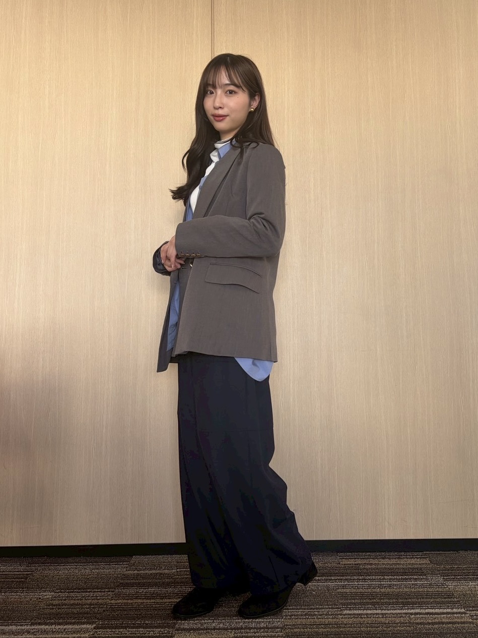 週の始まりは、ジャケット×スラックスの王道お仕事スタイルでシャキッと。アクセントにブルーシャツをレイヤード。フロントからチラリとのぞかせると、きちんとムードはそのままに洒落感が瞬時にUP!