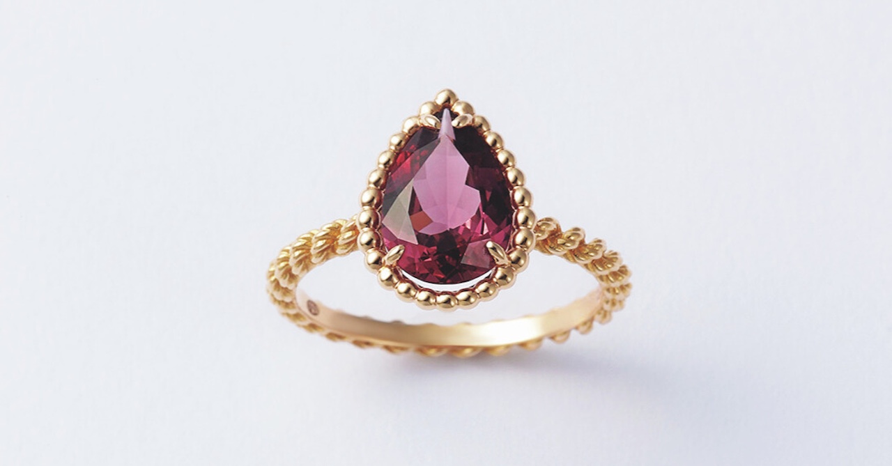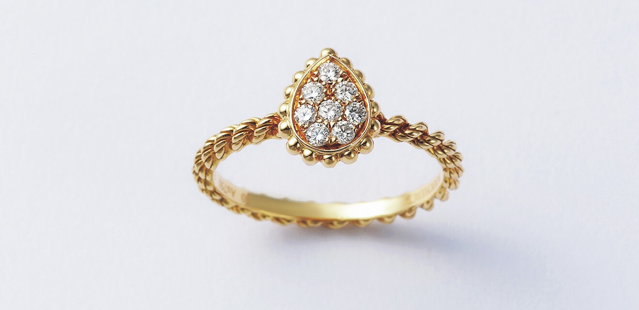 フランス発の名門ハイジュエラー・ブシュロンは、ラグジュアリーの聖地ともいわれるヴァンドーム広場にジュエラーとして初めて出店した格式あるメゾン。代名詞ともいえる「セルパンボエム」は、幸運の象徴でもあるスネークの頭をドロップモチーフでデザインしたのが特徴で、ツイストされたリングアームとの組み合わせは、もはやアートピースのような美しさ! ダイヤの他、5種ある色石は気品あふれる神秘的なカラーリング。お守りがわりの存在にも♡