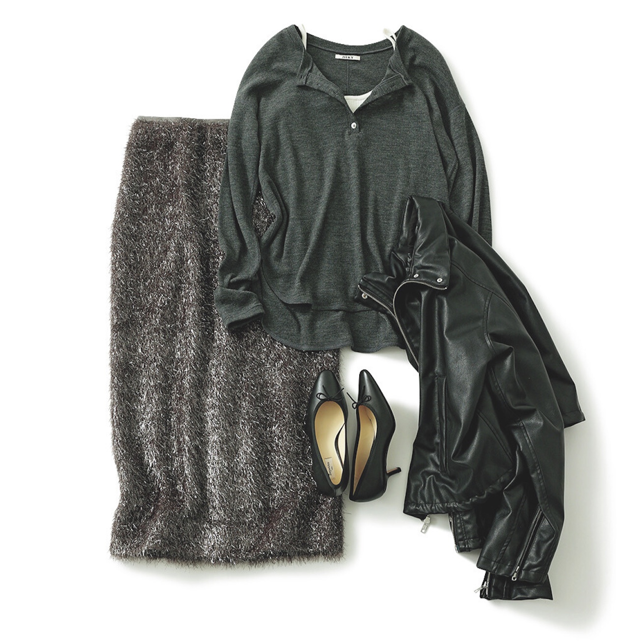 〝ビー・ゼロワン〟のネックレス[K18YG]¥327,800・リング [人さし指/K18WG]¥211,200・リング [中指/K18YG]¥272,800・リング [薬指/K18PG]¥280,500(ブルガリ・ジャパン<ブルガリ>)、ブルゾン¥27,500(AKTE)、カットソー¥16,500(JILKY<JILKY>)、中に着たキャミソール¥19,049(HANA SHOWROOM<ORR>)、スカート¥24,200(LOUNIE/ルーニィ)、靴¥97,900(ルック ブティック事業部<レペット>)