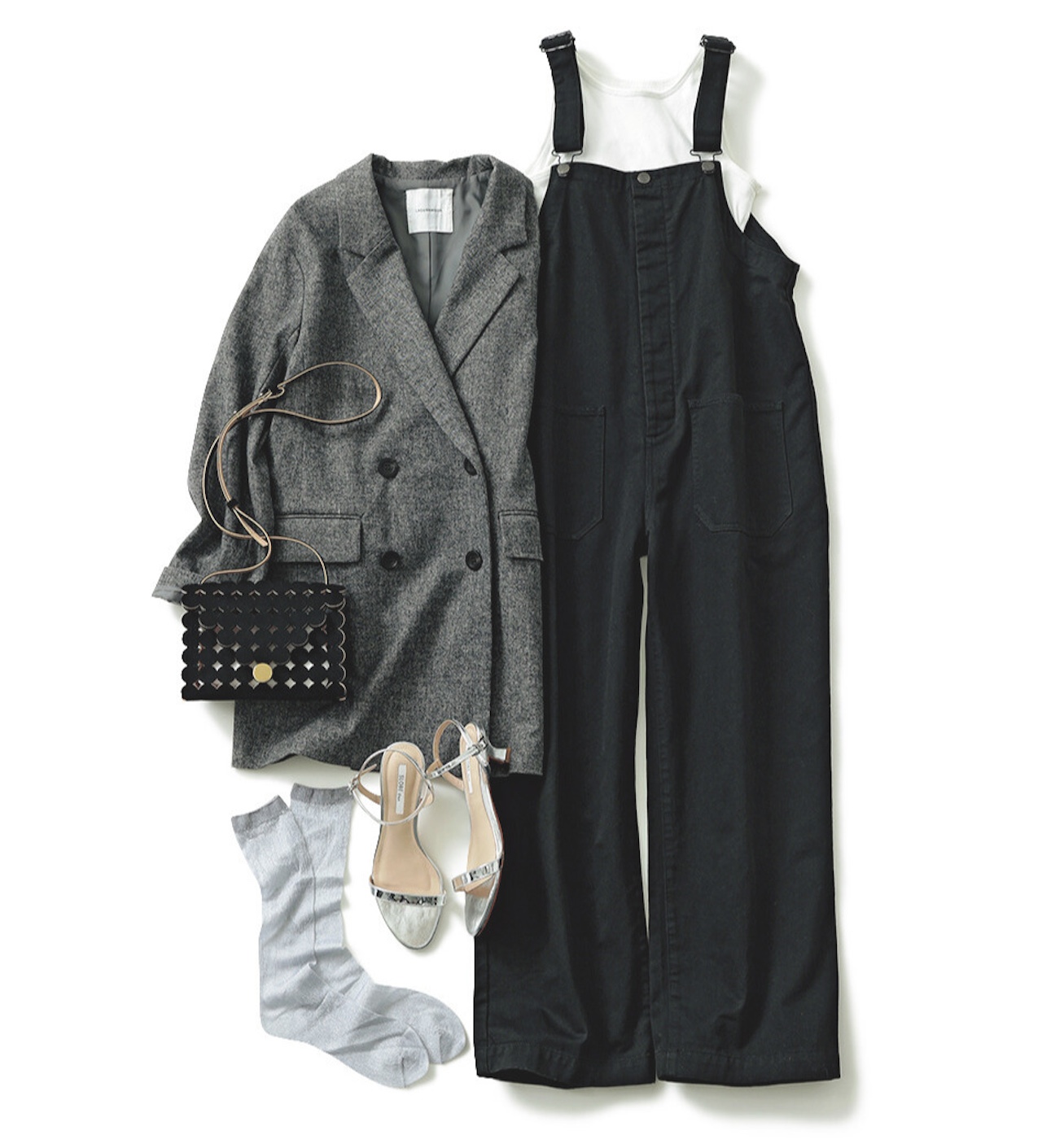 〝ティファニー T〟のピアス[K18YG×DIA]¥319,000・リング [左手人さし指上/K18YG×DIA]¥418,000・リング [左手人さし指下/K18YG]¥236,500・リング [右手/K18YG]¥495,000・バングル [K18YG]¥852,500(ティファニー・アンド・カンパニー・ジャパン・インク<ティファニー>)、ジャケット¥24,200(LAGUNAMOON ルミネ新宿2<LAGUNAMOON>)、サロペット¥29,700(ゲストリスト<ルミノア>)、バッグ¥33,000(MARY AL TERNA)、靴¥14,300(スローブ イエナ 自由が丘店<スローブ イエナ>)、靴下¥990(タビオ<靴下屋>)、タンクトップ/スタイリスト私物