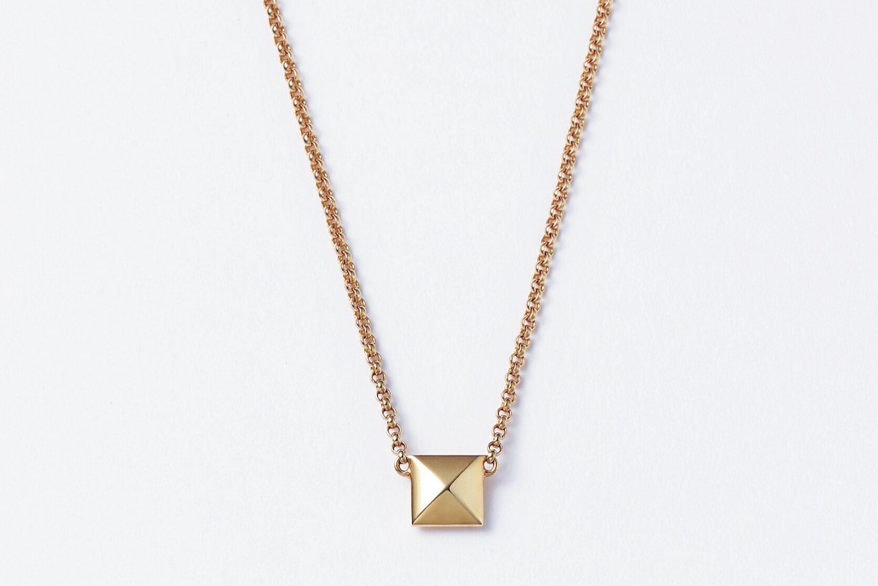 馬具工房としてスタートし、卓越したクラフトマンシップでレザーからジュエリーまで多岐にわたり名品を生み出してきたエルメス。曲線と直線が完璧なバランスで組み合わされたピラミッド型のスタッズをひと粒セットした「エルメス・クルー・ドゥ・H」のネックレスと、高度な職人技であるチェーン細工が古代風の趣を醸し出す「シェーヌ・ダンクル・ダナエ」のイヤカフ。芯のある女性を目指すなら、アイコニックなモチーフをシンプル服に潔く効かせたい!