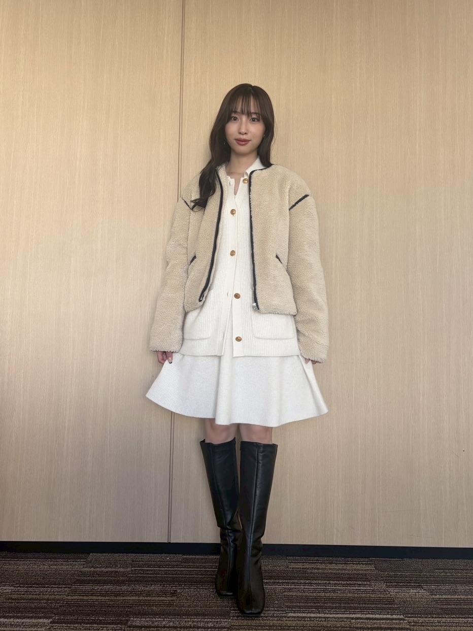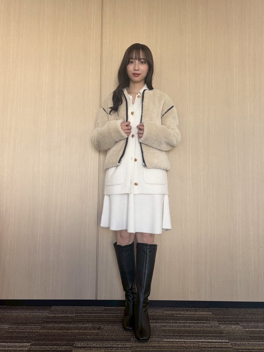 ■11/25(火)/ベージュボアジャケット×白ニットミニワンピース