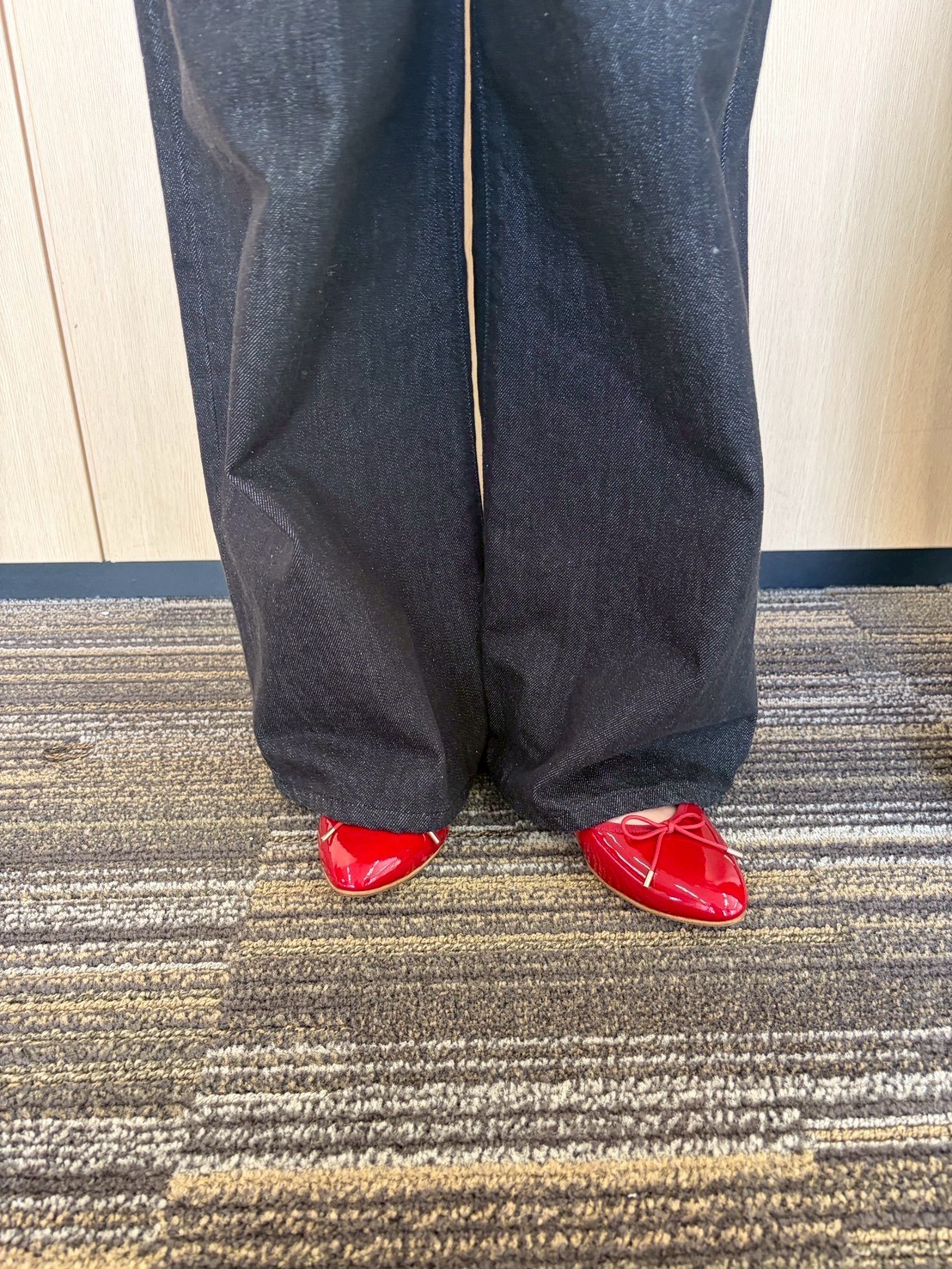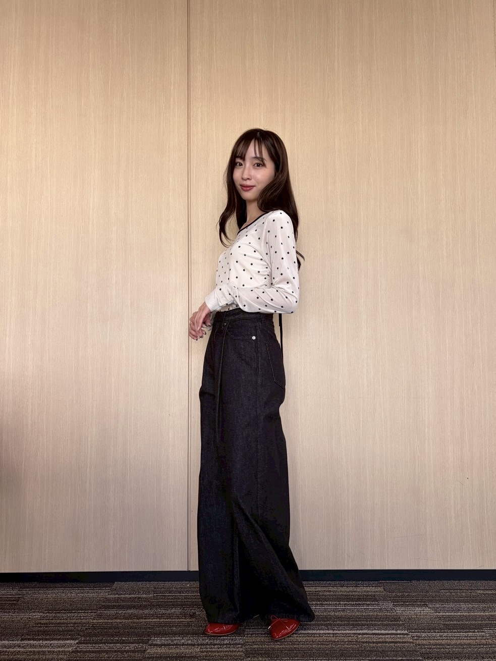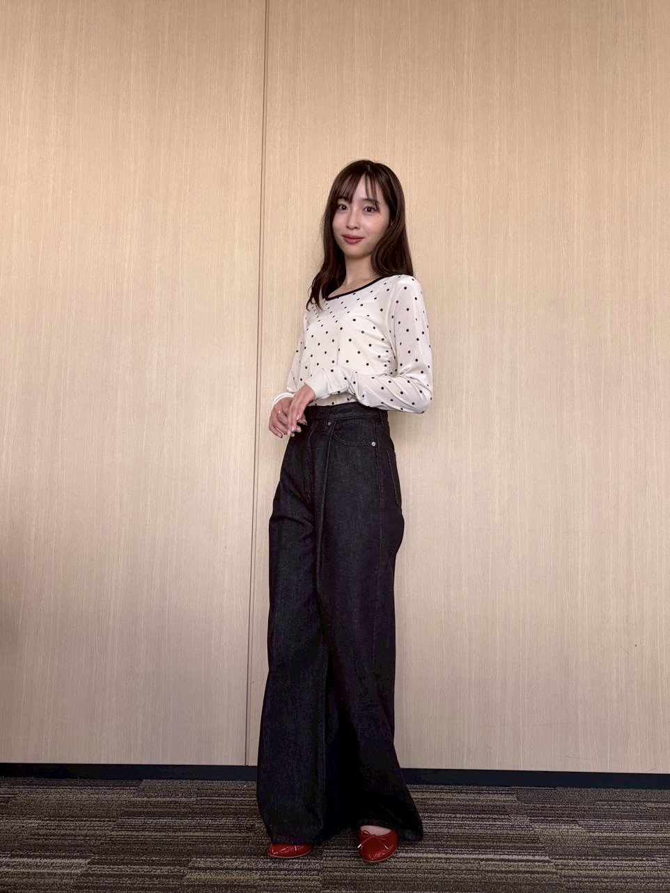 ベロア素材のドット柄トップスと赤のバレエシューズで作るフレンチガーリー♡ ブラックデニムで全体をシャープに引き締めると、かわいさの中に大人っぽさが漂って◎。秋のおでかけにぴったりなカジュアルスタイル。