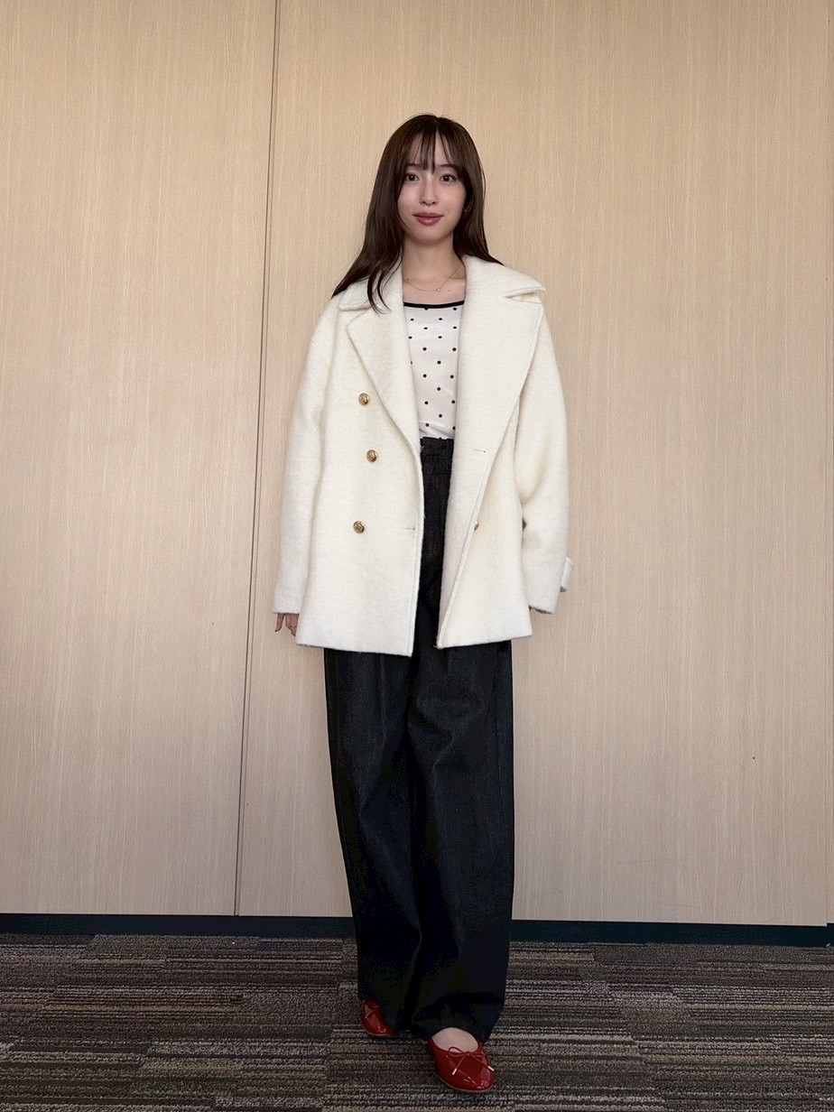 ドット柄に赤を組み合わせて、簡単バレエコアの完成【林さんの白シャギーPコート着用画像5枚】