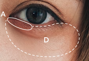 ②下まぶたの目頭から黒目下までAを幅広めにしっかりと重ねるようにラインを引く。そのラインからつながるようにDで大きく涙袋を作るイメージで、目周りからチークまで、内→外に向けてじゅわっと血色を広げる。